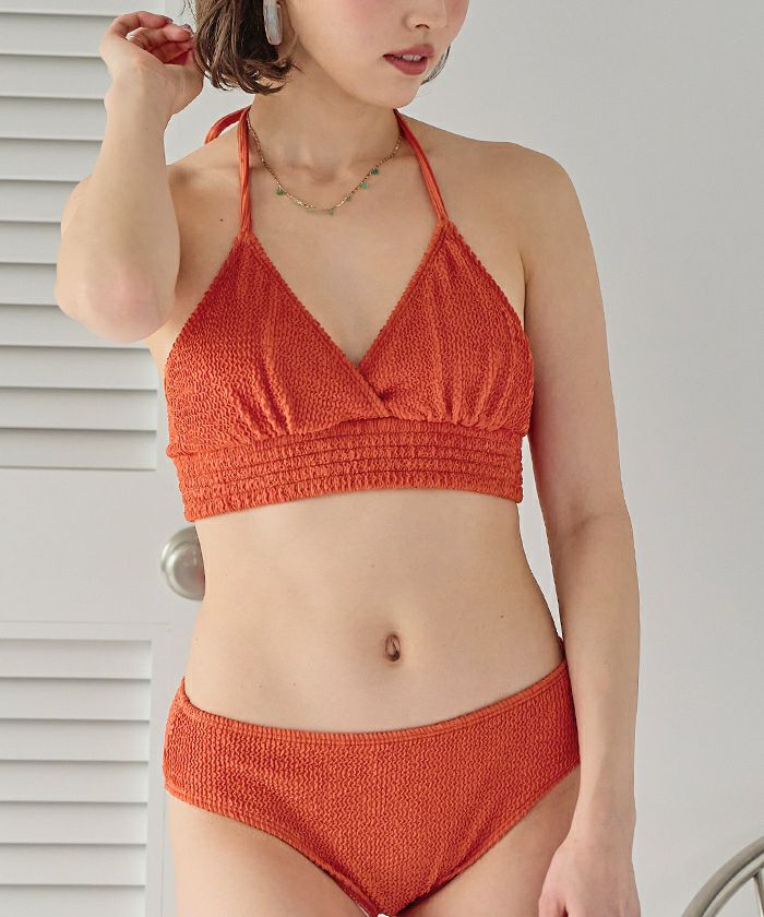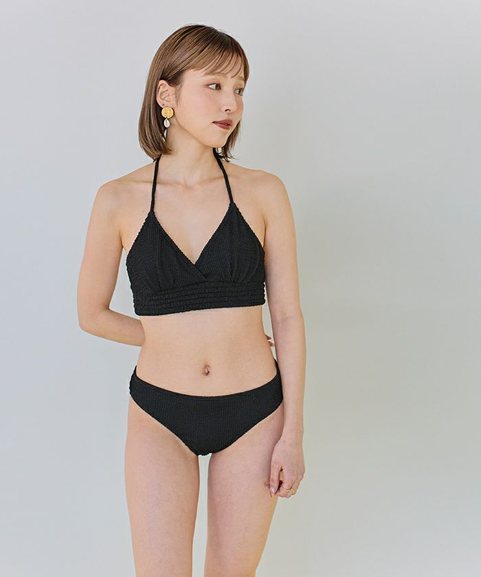 ・立体感のある波カット素材がビーチ映えする三角デザインホルターネックビキニ。
