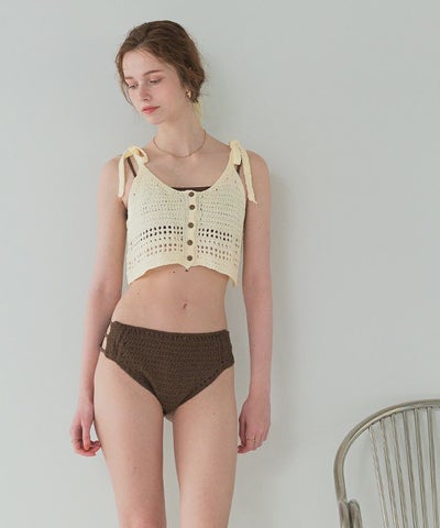 ・かぎ編みニットのショルダーリボンクロシェキャミソールが付いた3点セットビキニ。