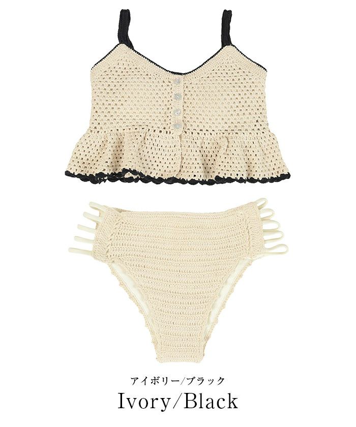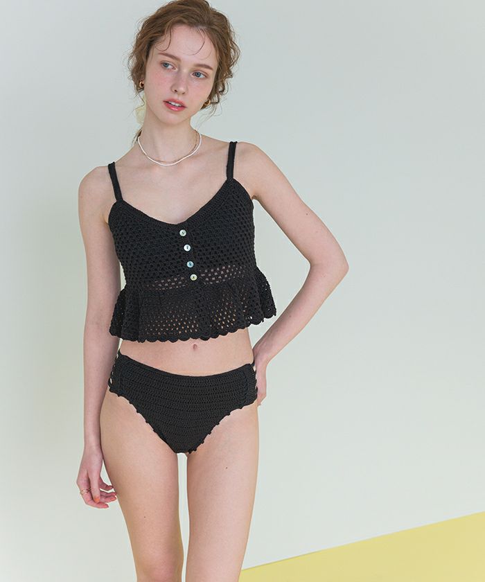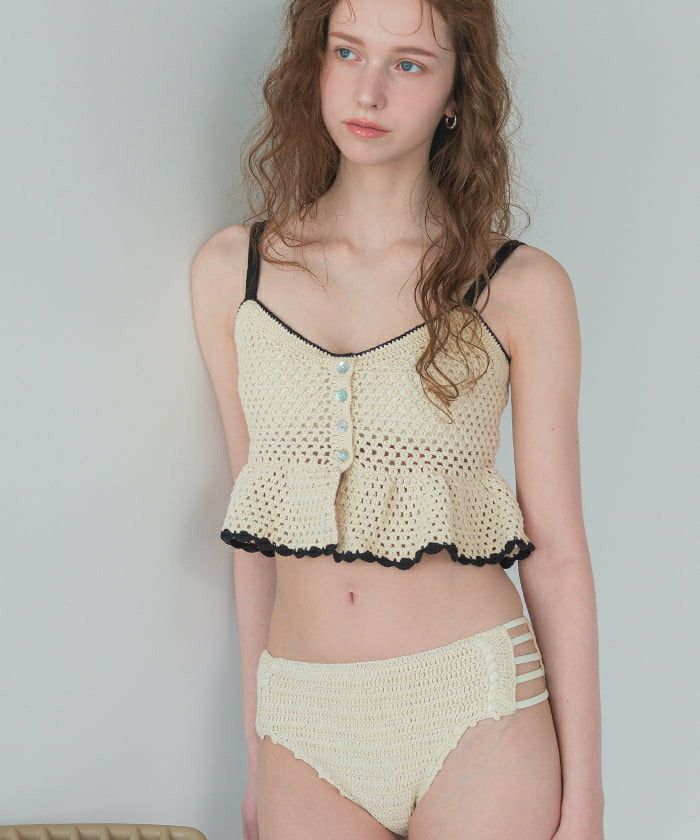 ・クロシェ編みの透け感が大人可愛いペプラムフレアビスチェビキニ。