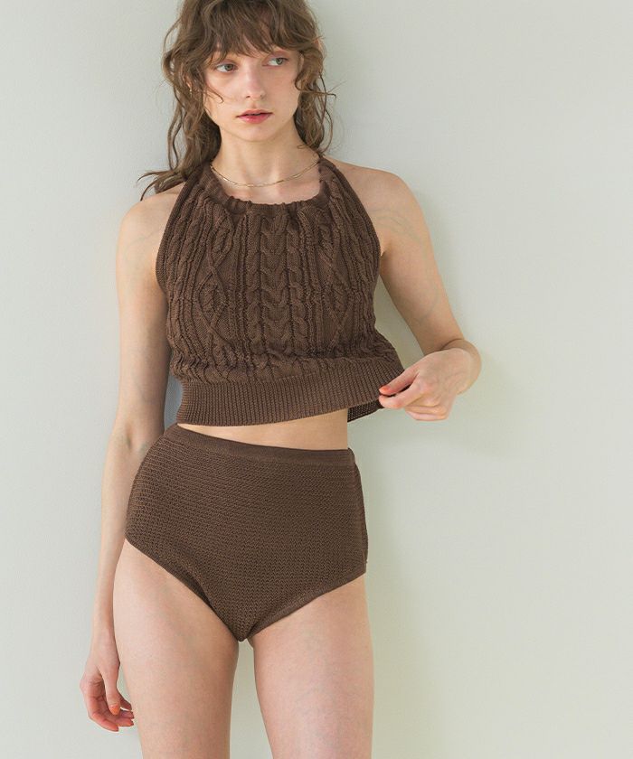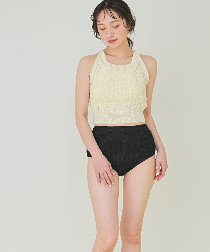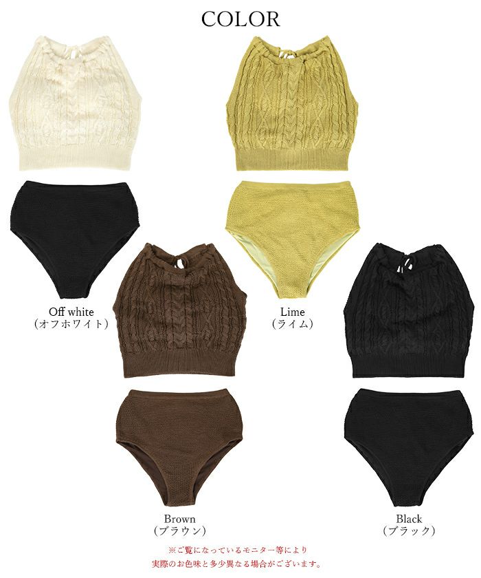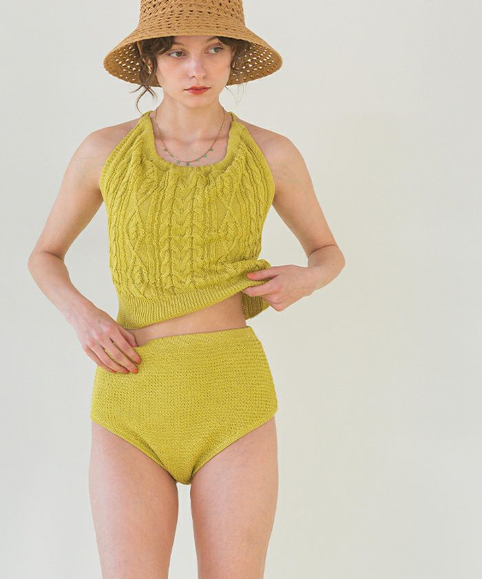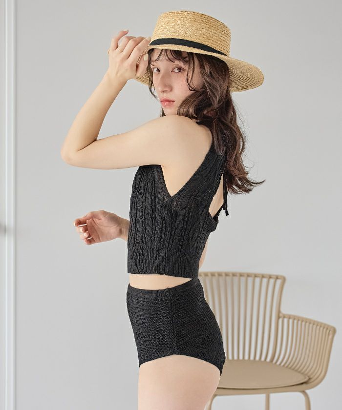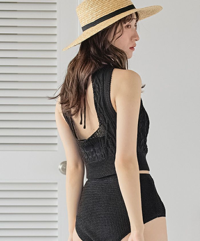 ・シャリ感のあるサマーニット素材で着心地の良いバックオープンデザインニットビキニ。