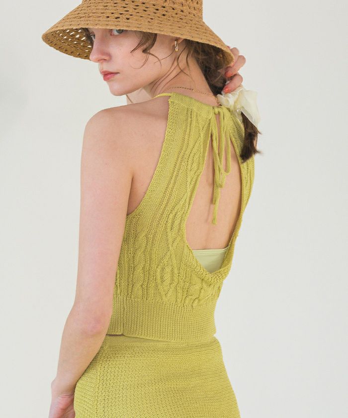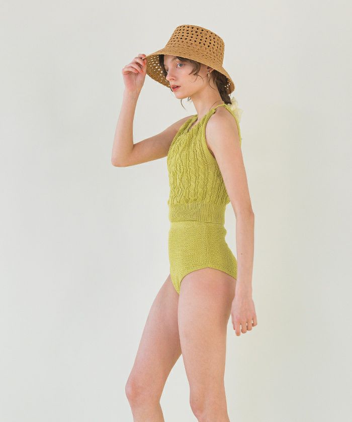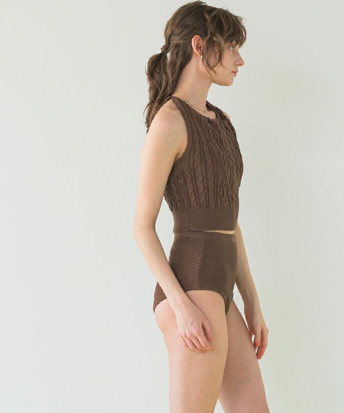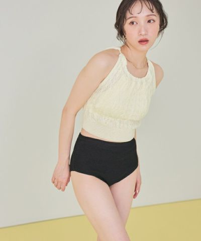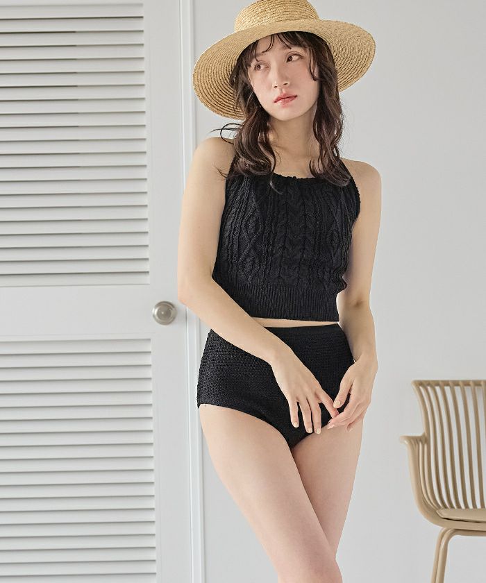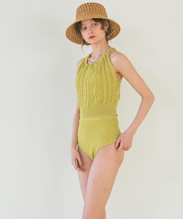 ・シャリ感のあるサマーニット素材で着心地の良いバックオープンデザインニットビキニ。