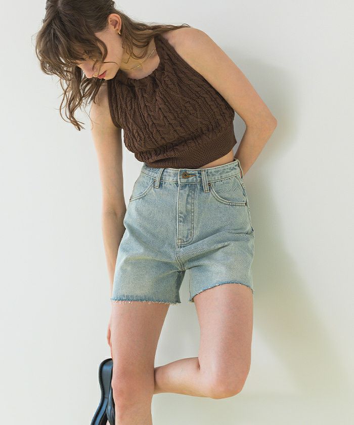・ケーブルデザインニットトップスとシンプルデザインニットハイウエストショーツの組み合わせで、まとまりのある大人っぽいスタイリングを叶えます。