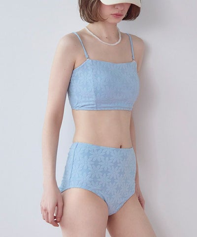 ・立体的な同色の花柄が大人可愛いパイル地バンドゥビキニ。