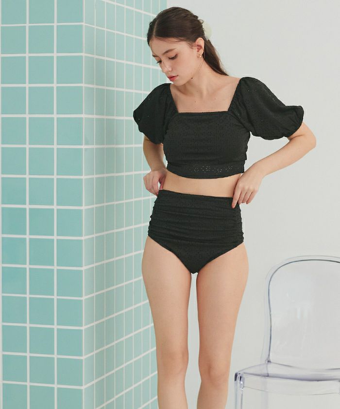 ・パフスリーブデザイン×レース素材が大人可愛いハイウエストビキニ。