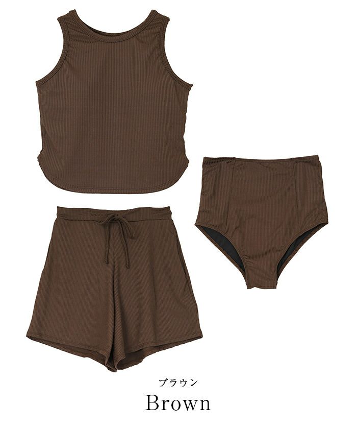 ・ヘルシーなスタイリングを叶えるカップ付きタンクトップ×ハイウエストショーツ×ウエスト紐付きショートパンツの3点セット水着。