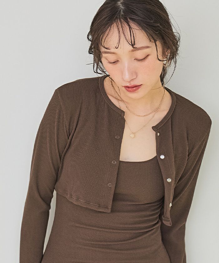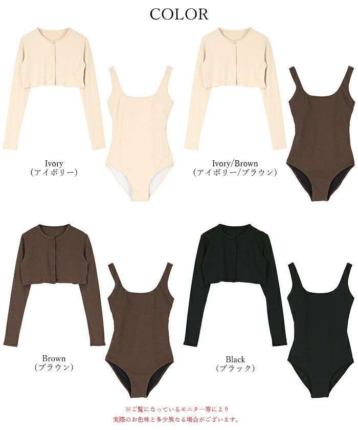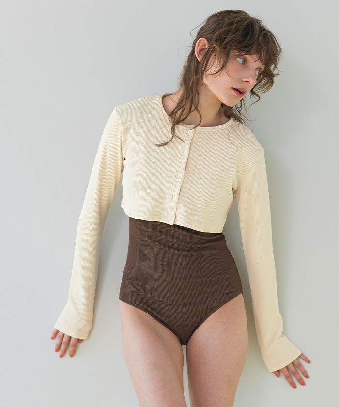 ・リブワンピース水着と同素材の長袖ショート丈カーディガン付きのセット商品。