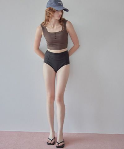 ・ヘンリーネック風のフロントボタンが目を引くハイウエストビキニ。