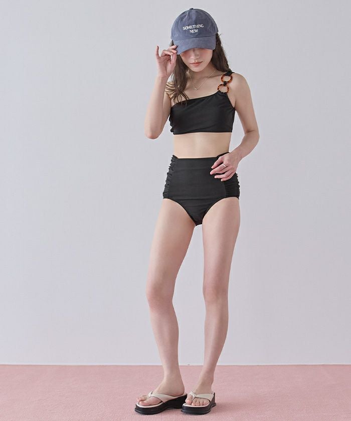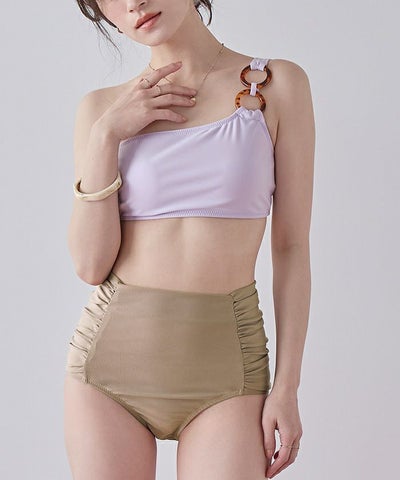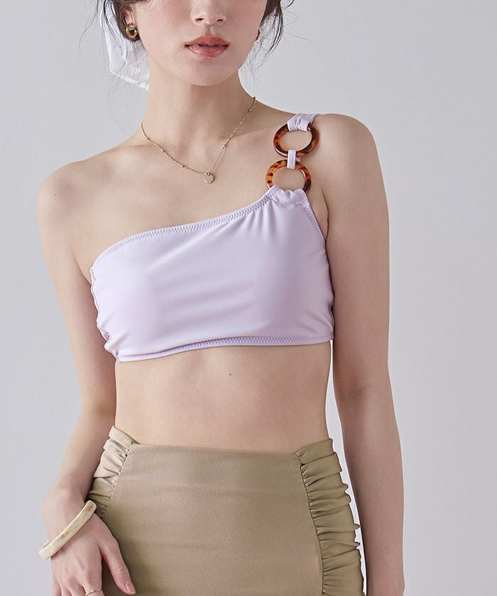 ・ワンショルダー×べっ甲風リングが目を惹く、モードな雰囲気のビキニ。
