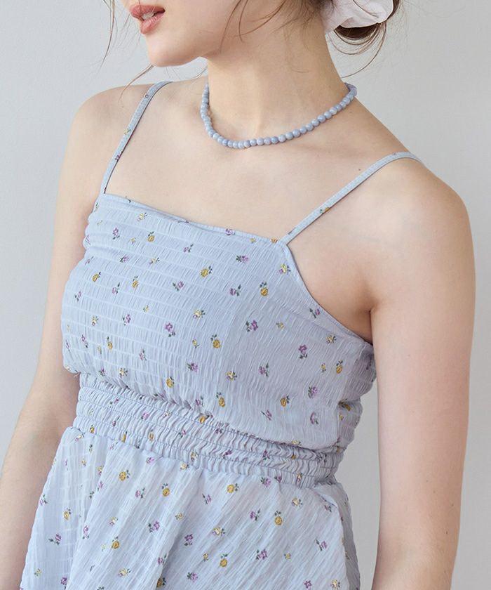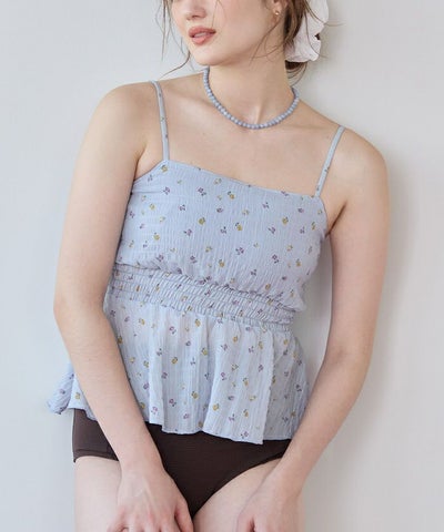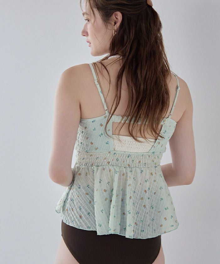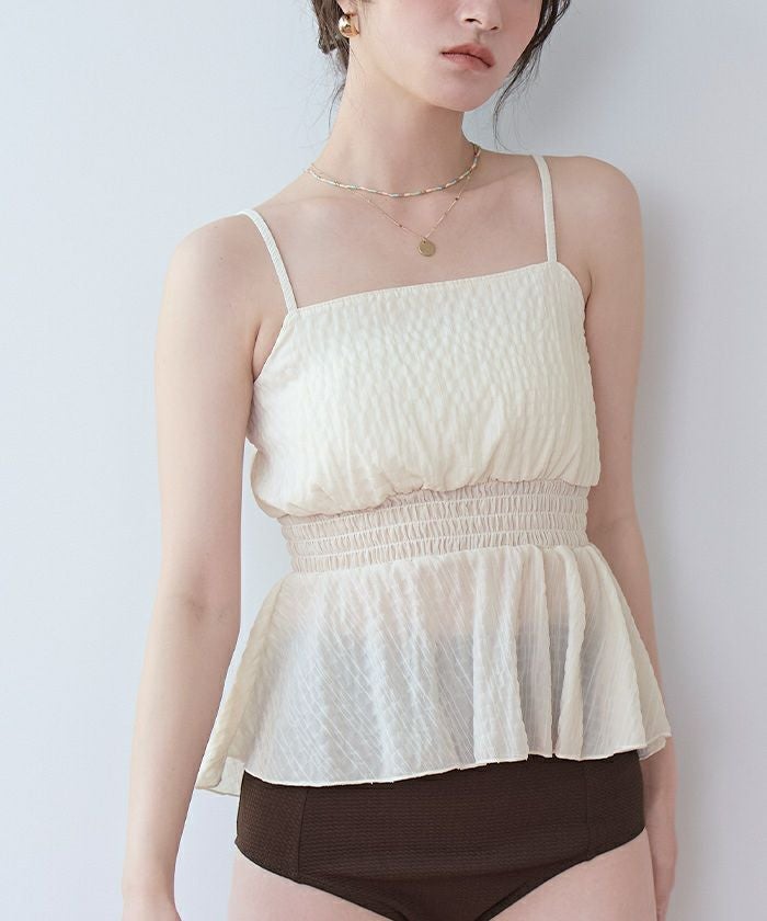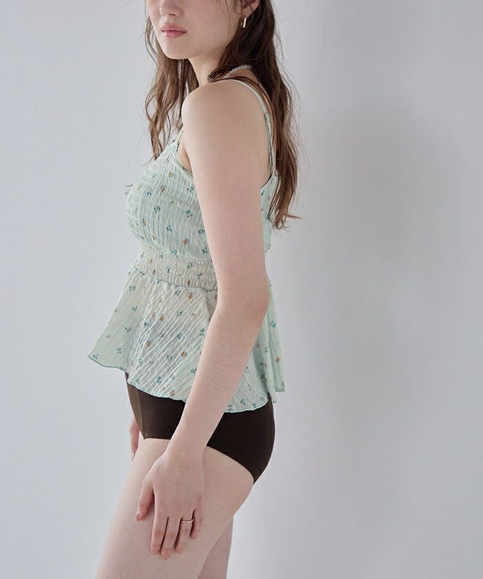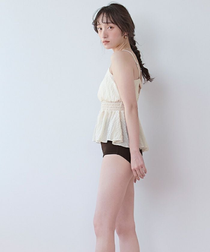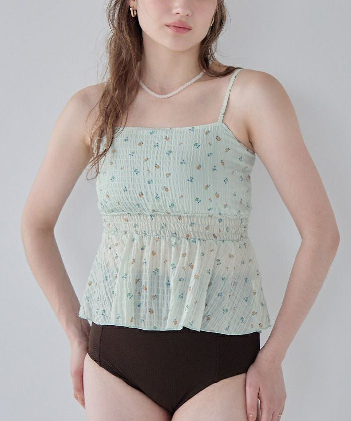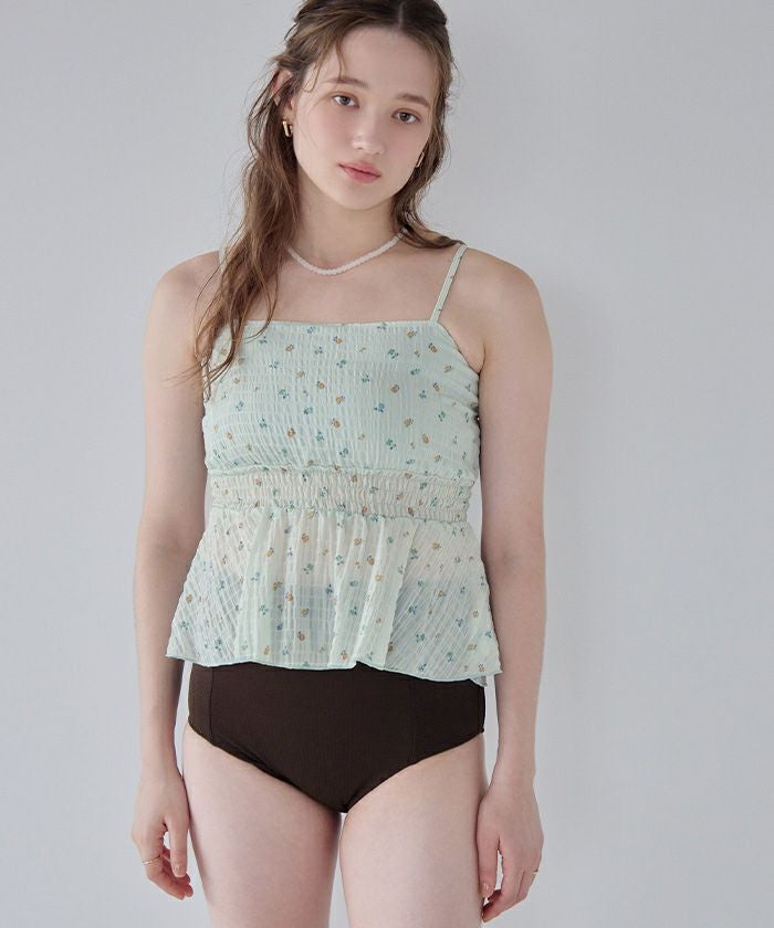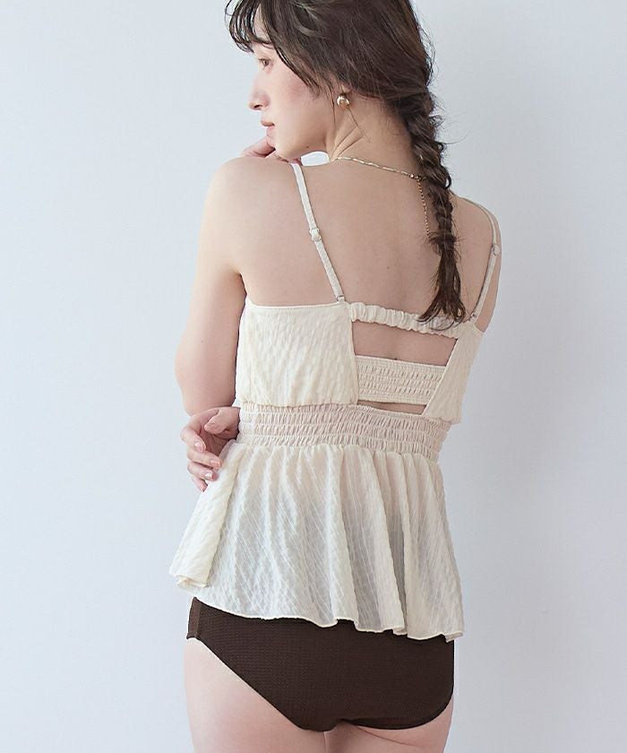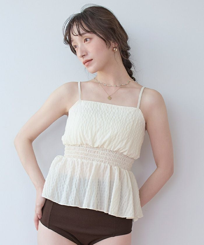 ・軽やかなシャーリングトップスがセットになった3点セット水着。
