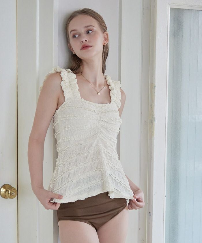 ・肩部分のフリルストラップは柔らかく、程よく肩ラインにフィットします。