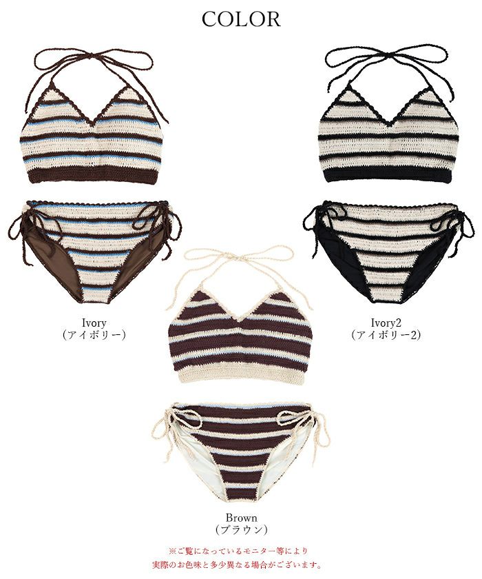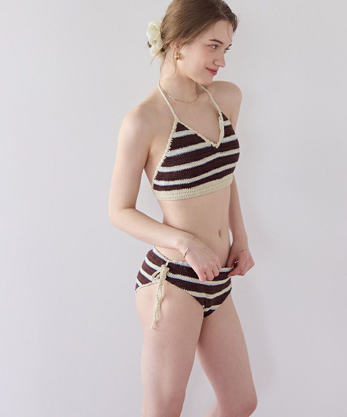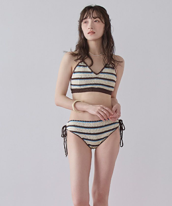 ・クロシェ編みの風合いが可愛いマルチボーダービキニ。