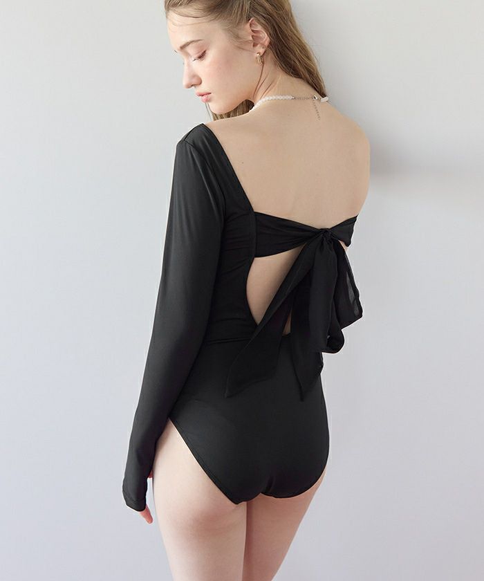 ・バックは大きく開いたデザインで、動くたびふんわりと揺れるリボンが女性らしさを引き立てるポイント。