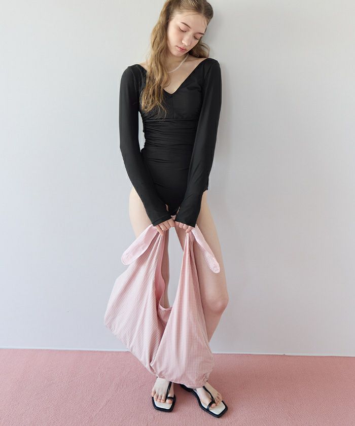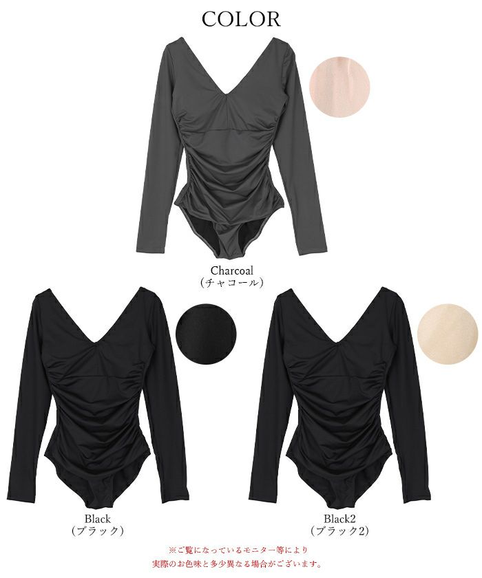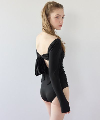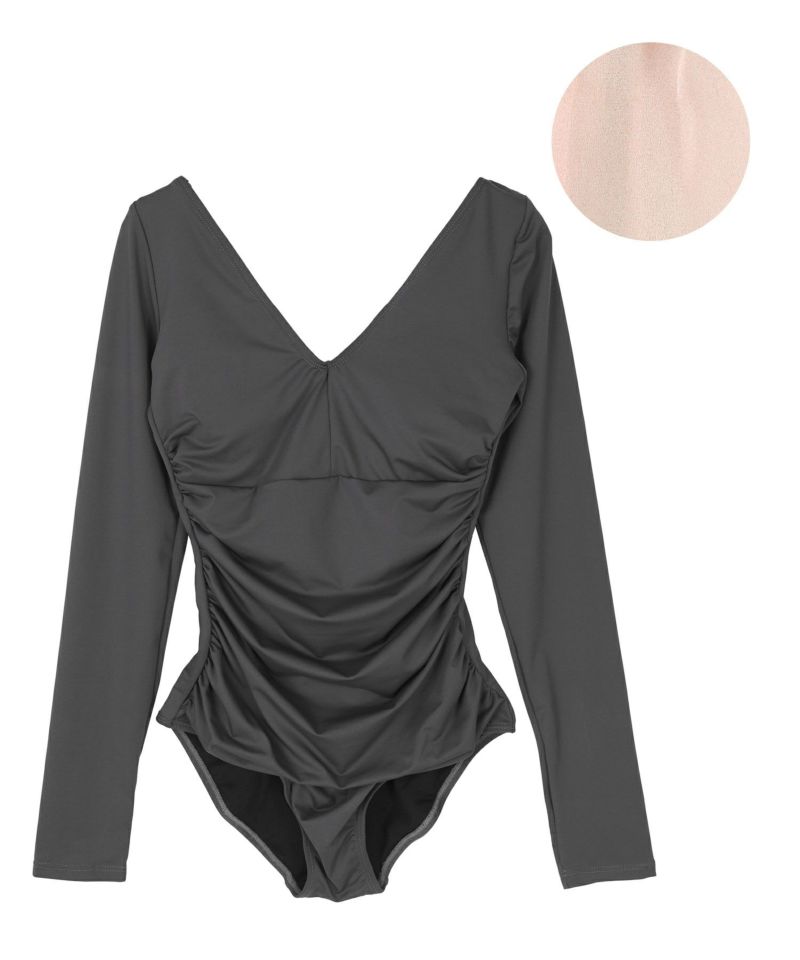 ・前脇の細かなギャザーが立体感を生み、身体のラインをすっきり見せてくれる長袖ワンピース水着。