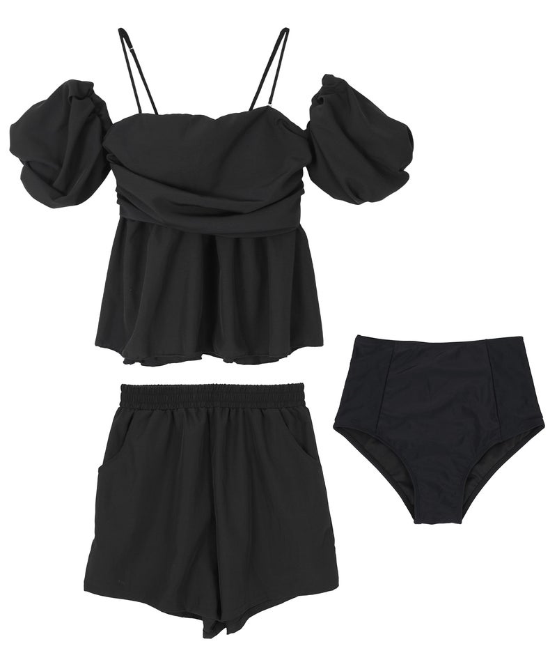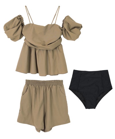 ・ふんわりとしたフレアシルエットが可愛い、オフショルダービキニとショートパンツの3点セット。
