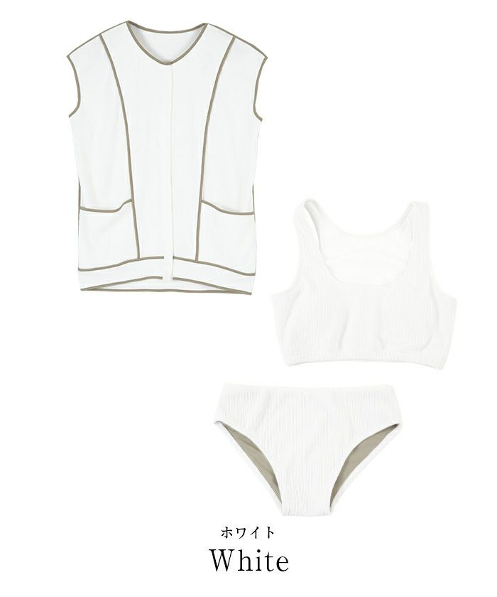 こだわりの素材と色使いがポイントのトップス、ラインがキレイに見えるシンプルビキニデザインの3点セットビキニ。