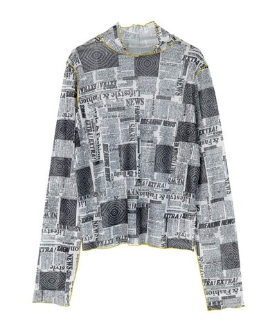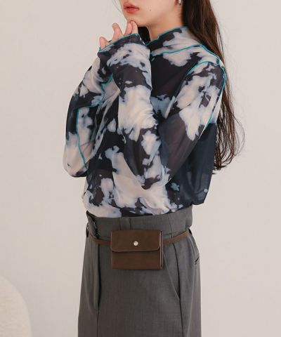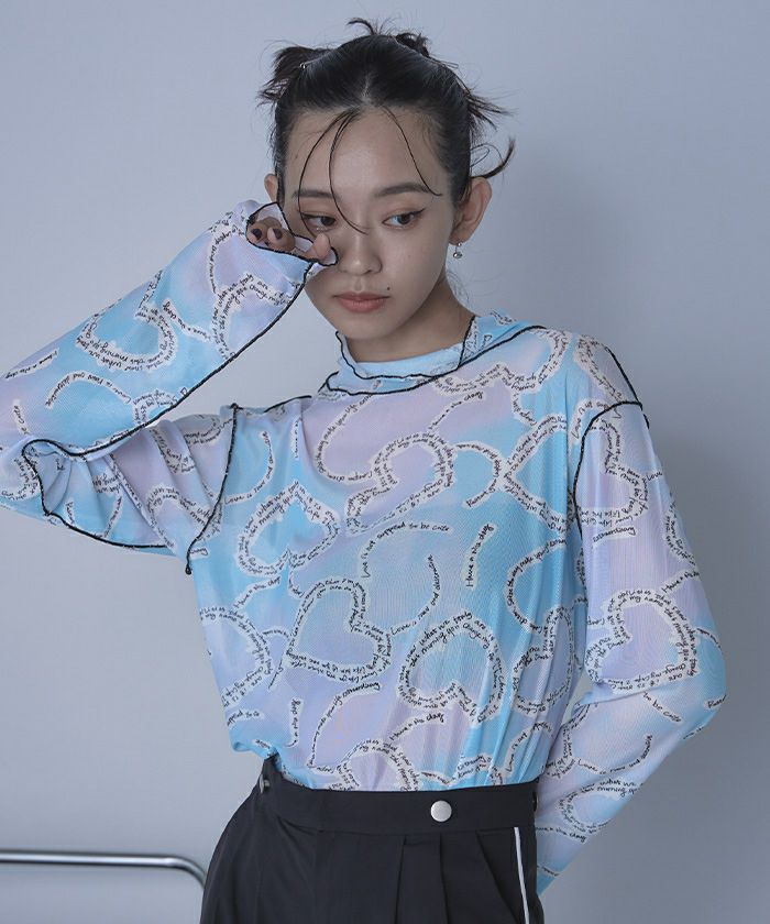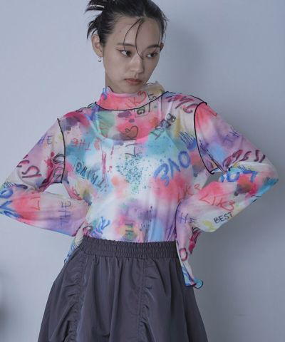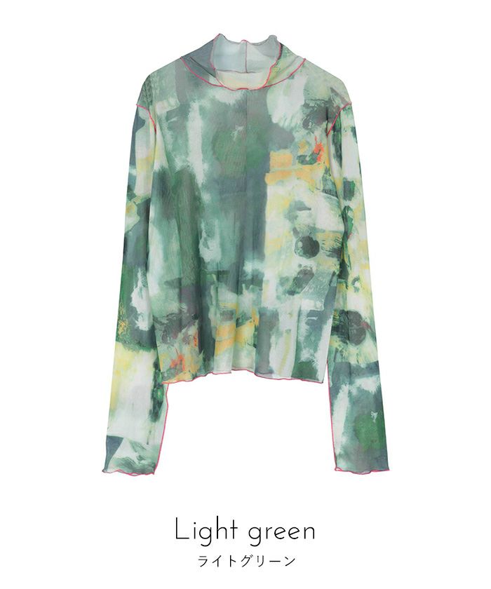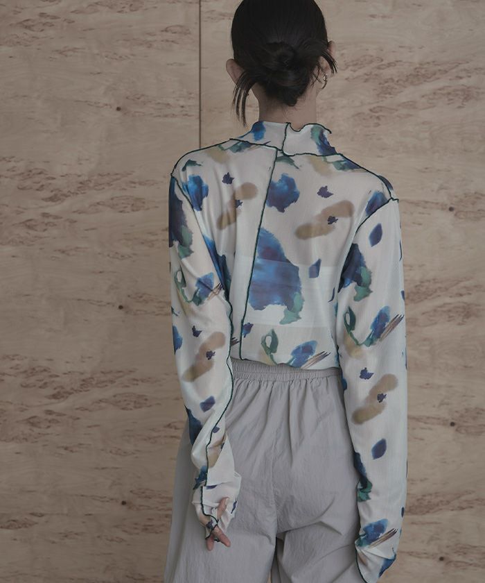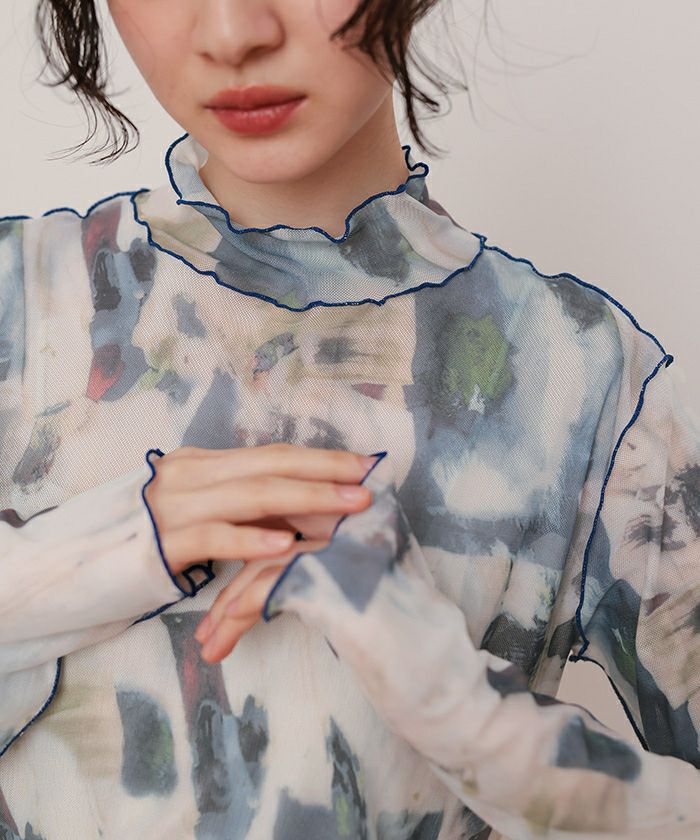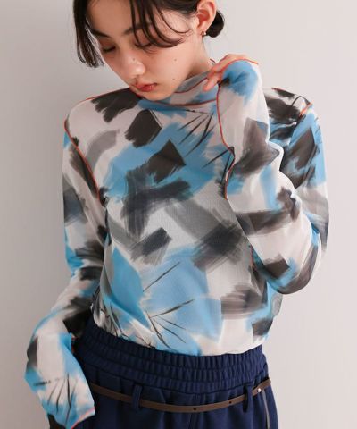 ・プリントのシアー素材を使用したチュールシアートップス。