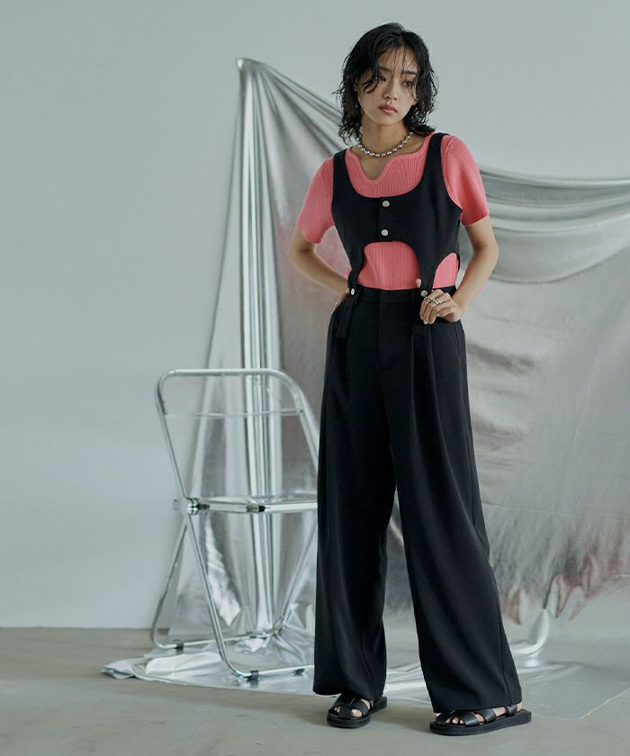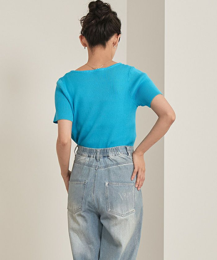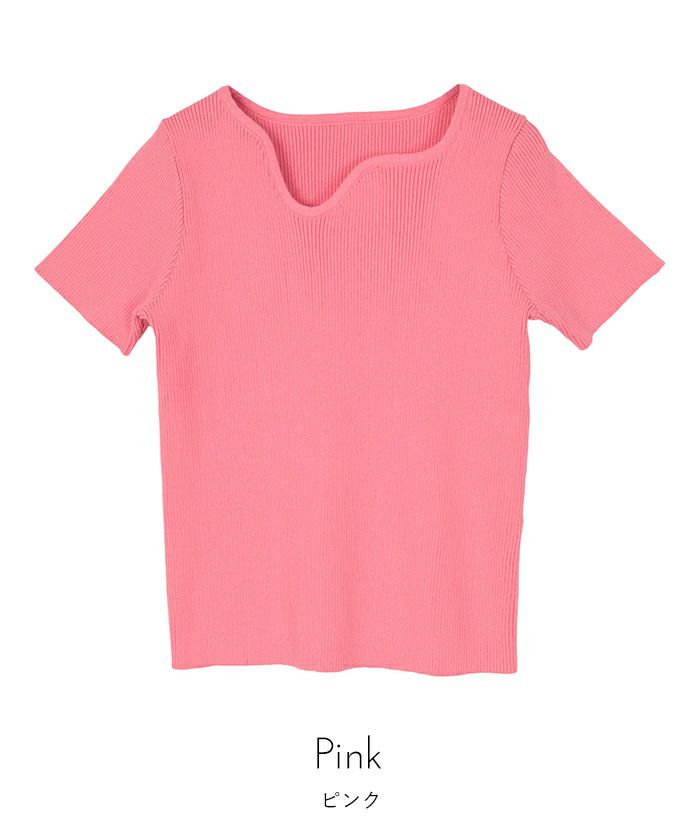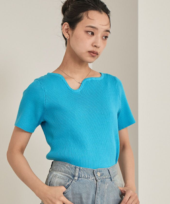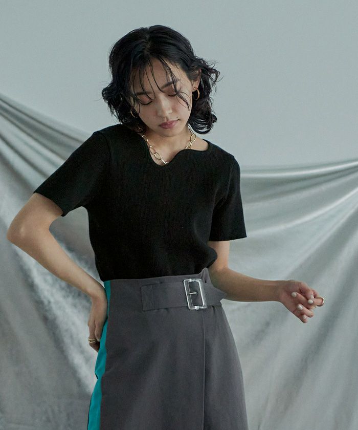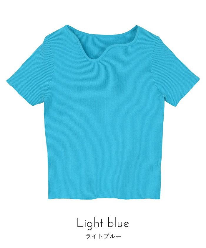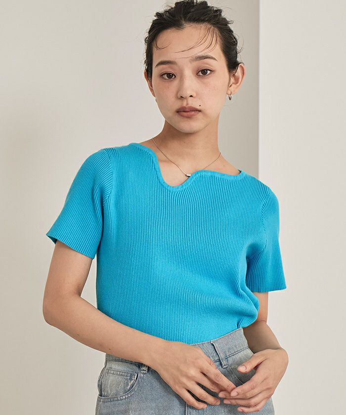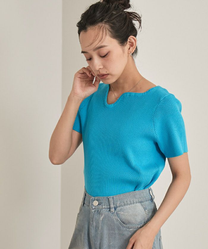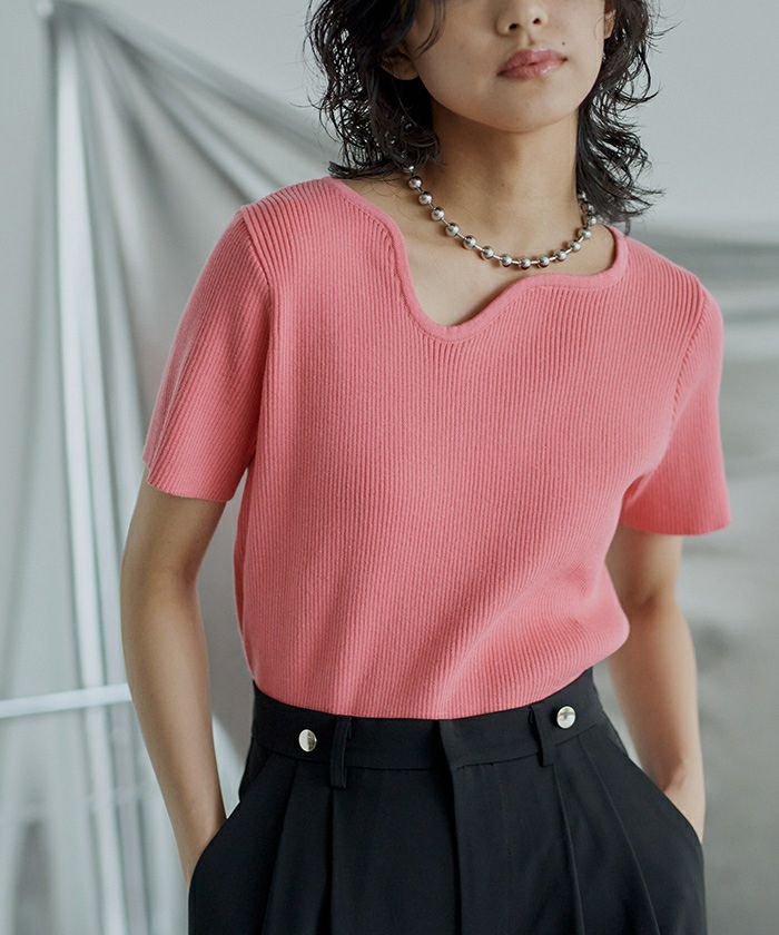 ・個性的なウェーブネックラインが魅力のリブニットトップス。