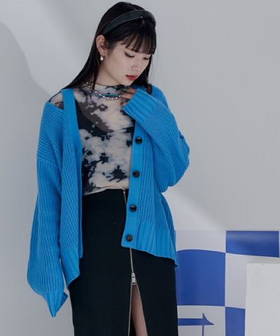 ・深めのVネックに首元のスリットが抜け感を演出するカーディガン。