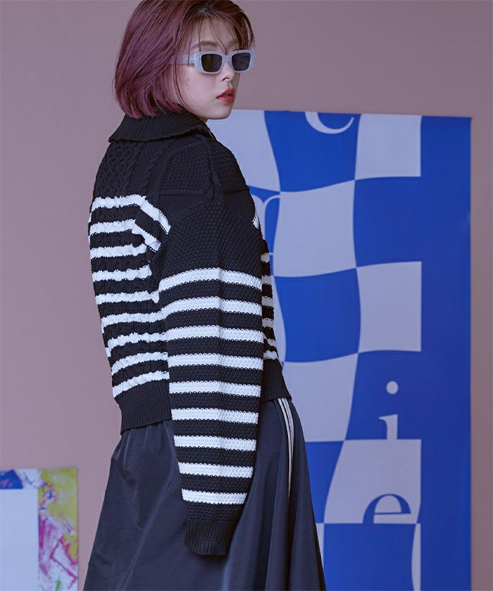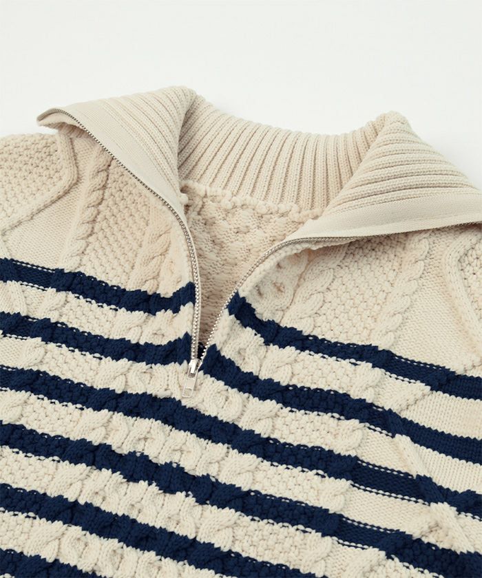 ハーフジップボーダーケーブルニット 【miette ミエット】