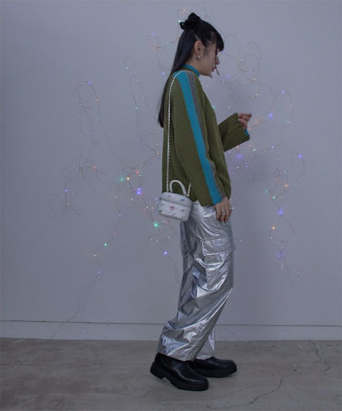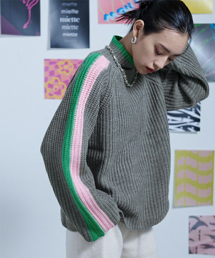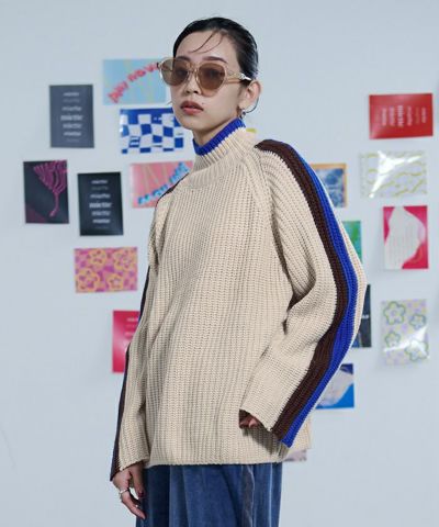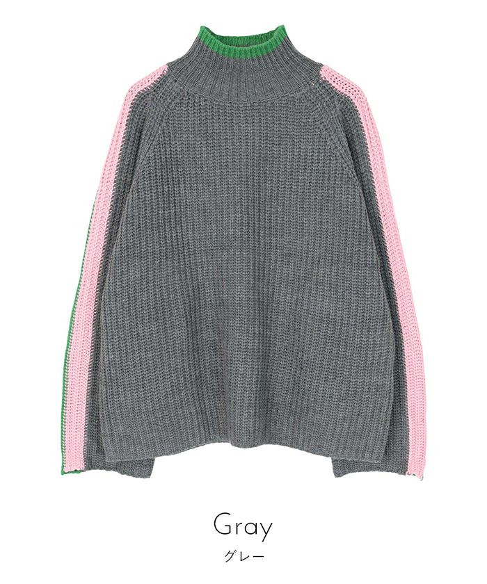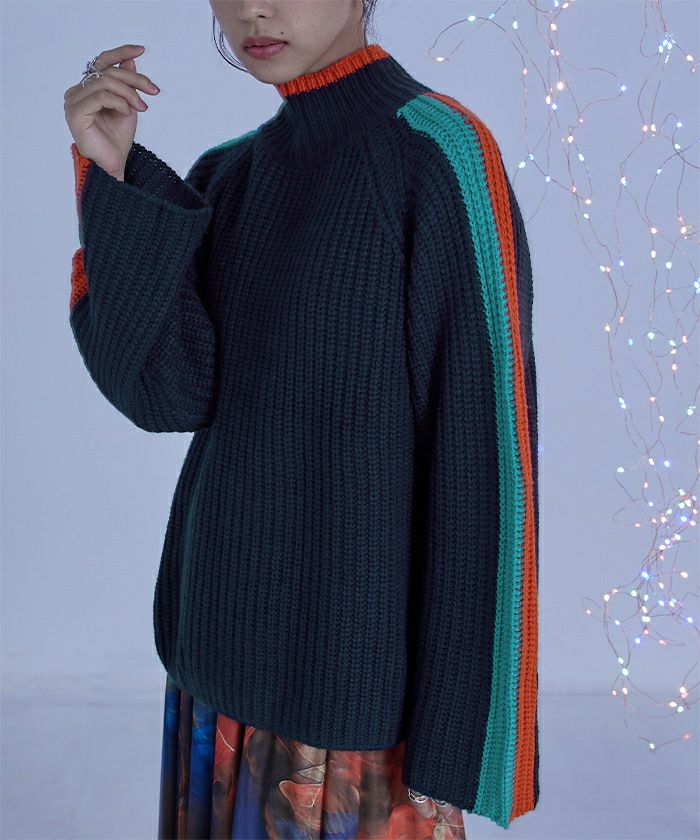 ・袖の2色の配色ラインがポイントのハイネックニット。