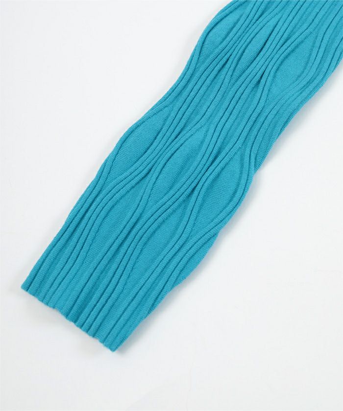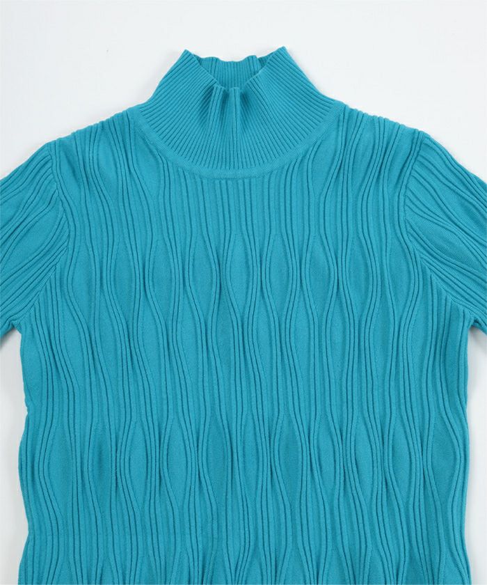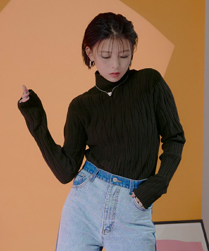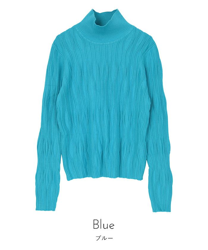・ウェーブの編み地が特徴的なハイネックニットトップス。