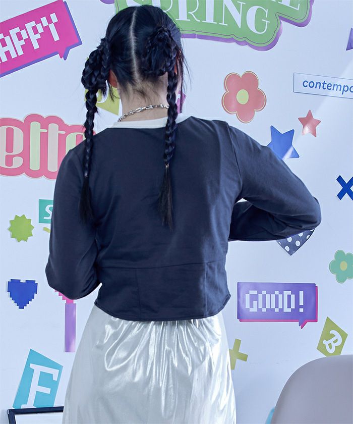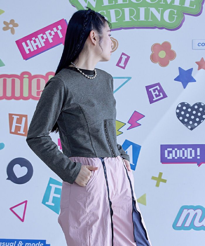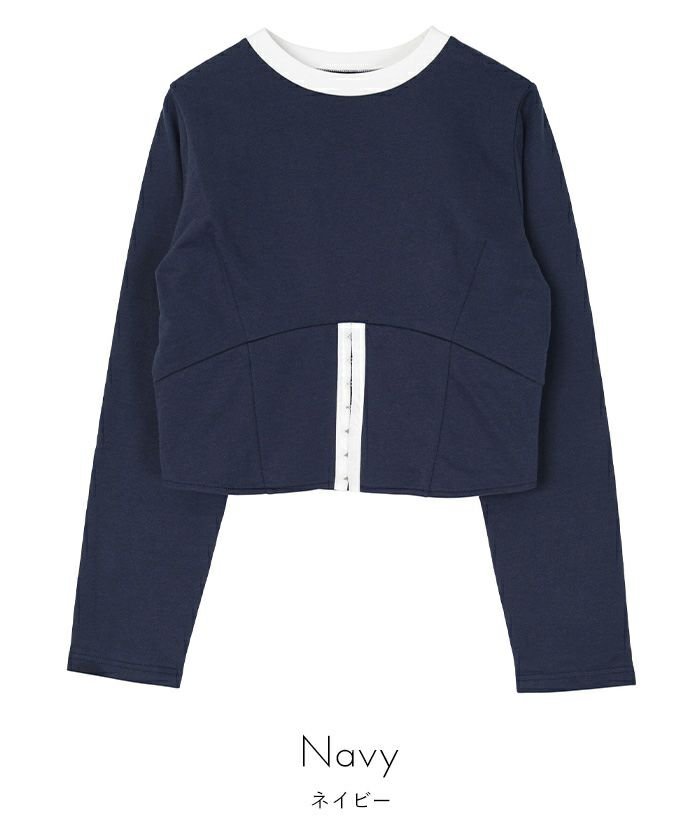 ・コルセットデザインがポイントのミニ裏毛トップス。
