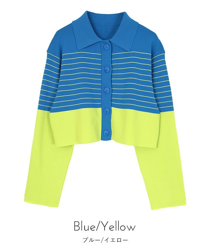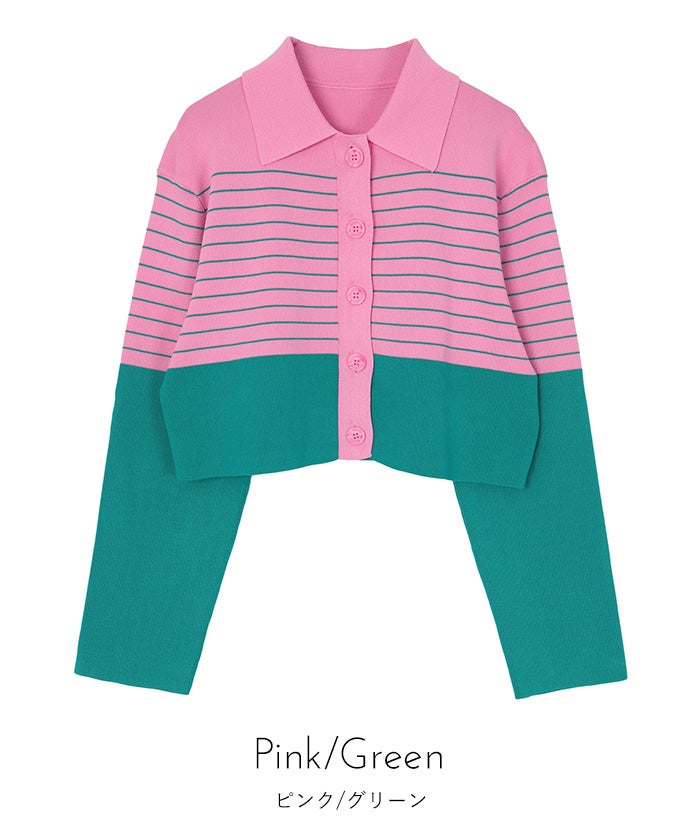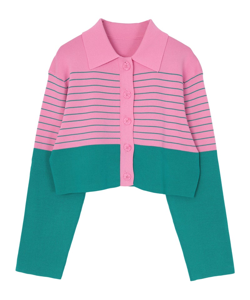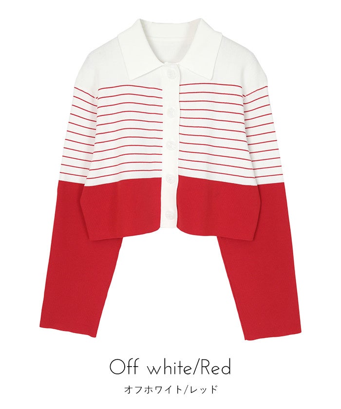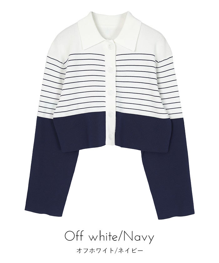 ・バイカラーの襟付きボーダーカーディガン。
