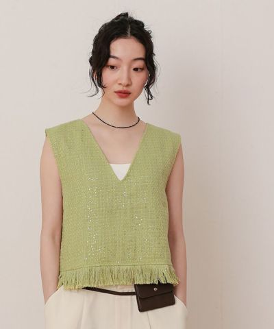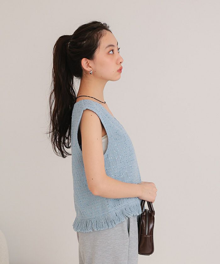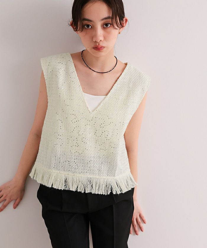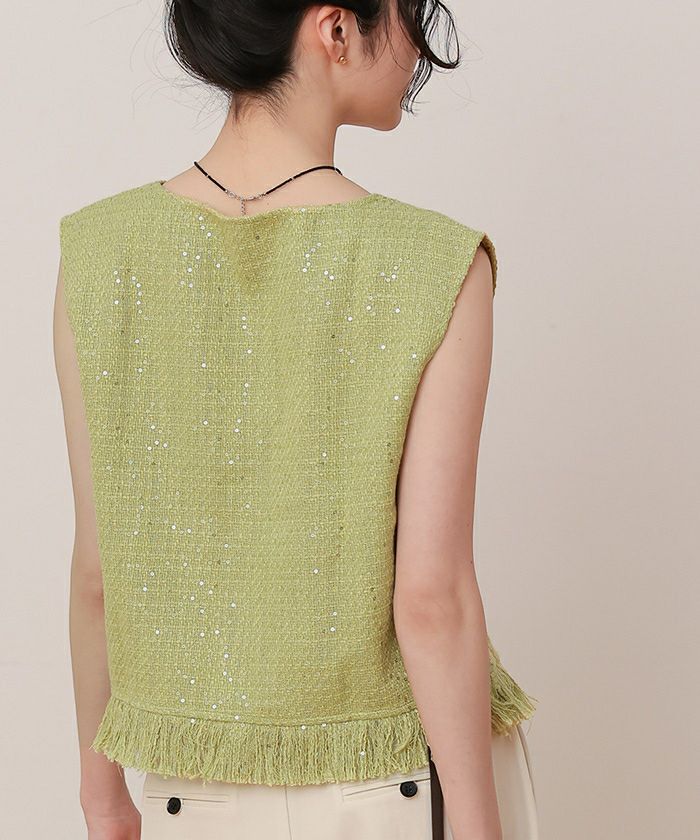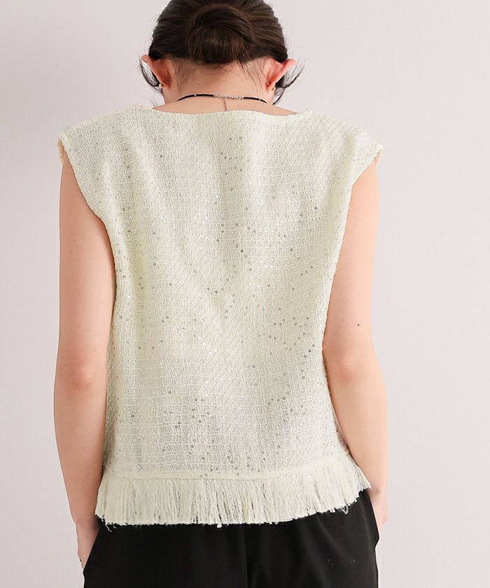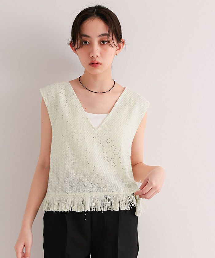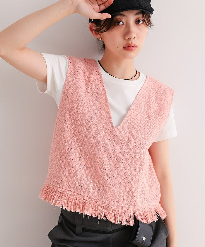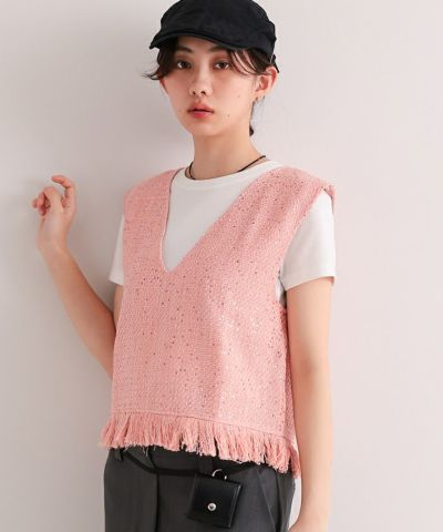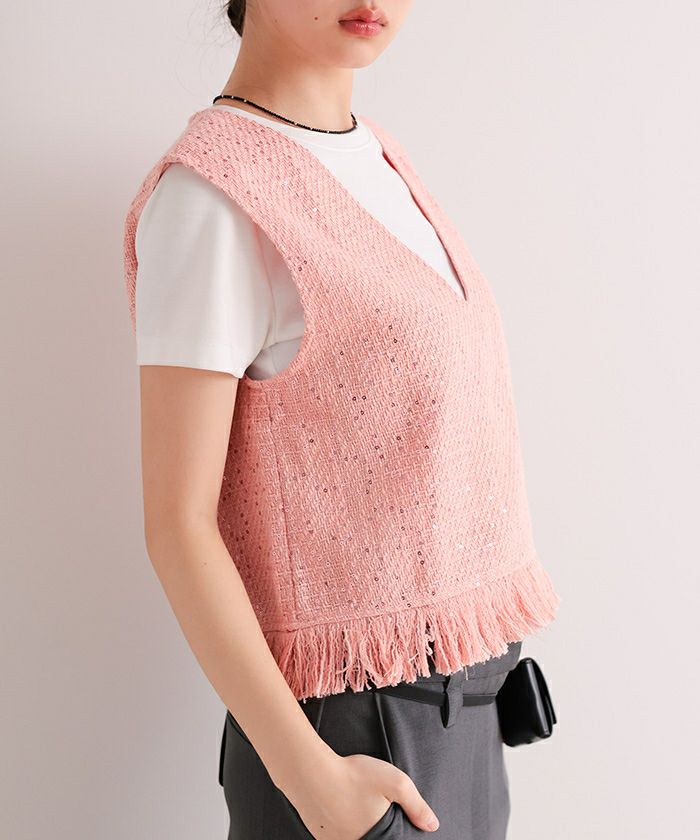 スパンコールツイードフリンジショートベスト【miette ミエット】【メール便可/90】