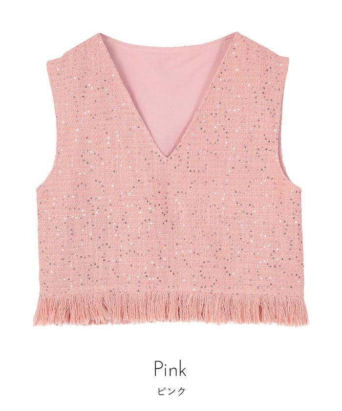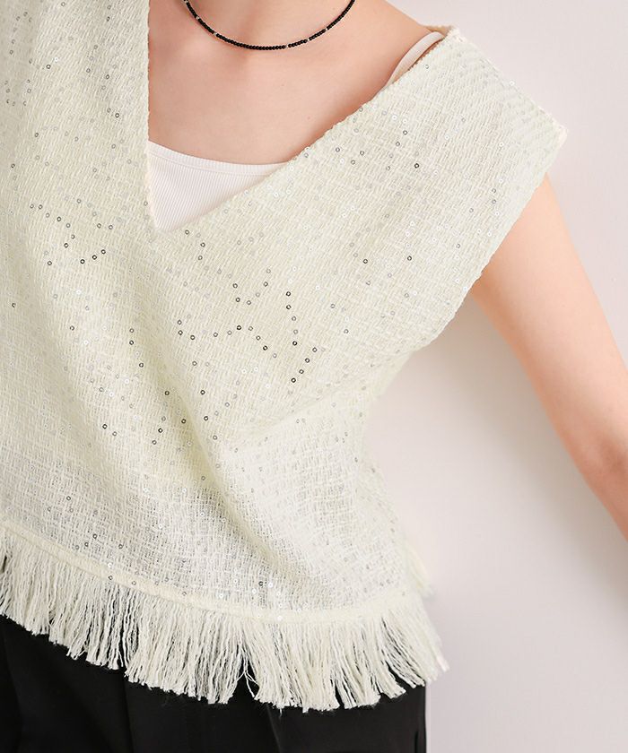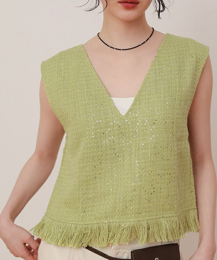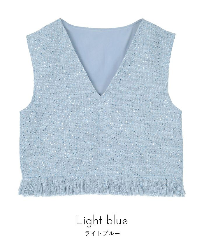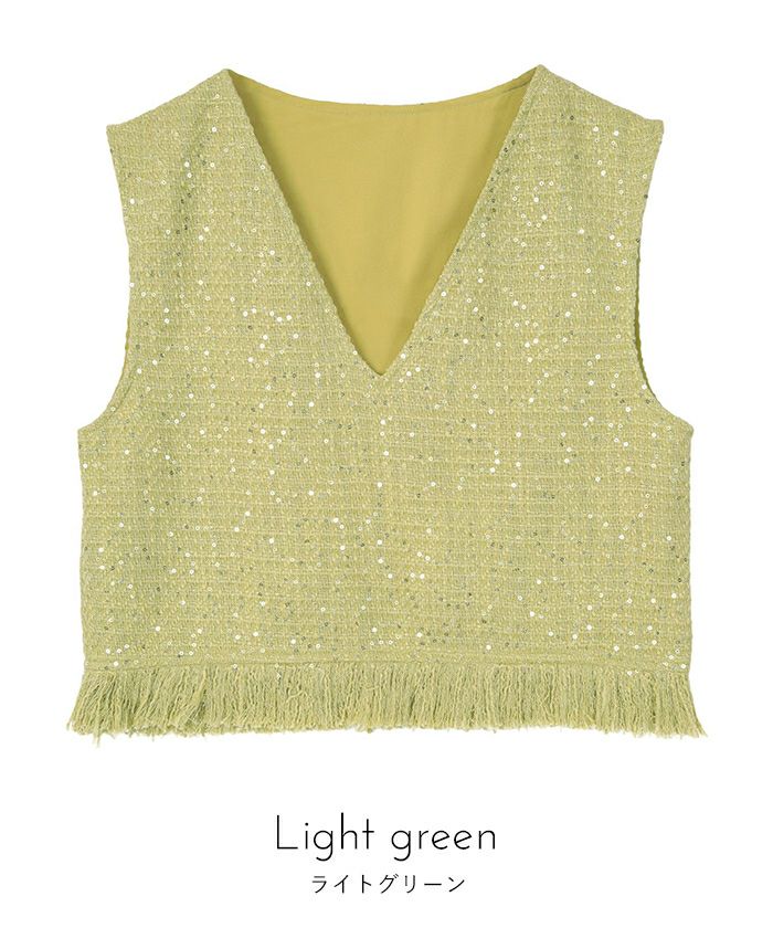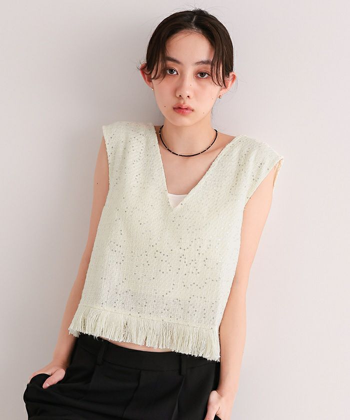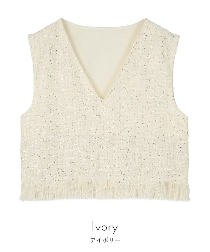 スパンコールツイードフリンジショートベスト【miette ミエット】【メール便可/90】