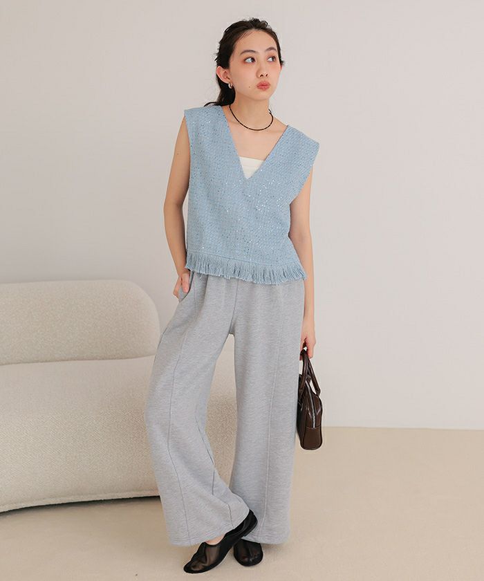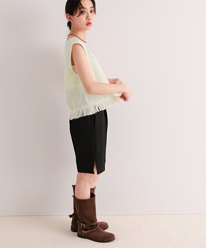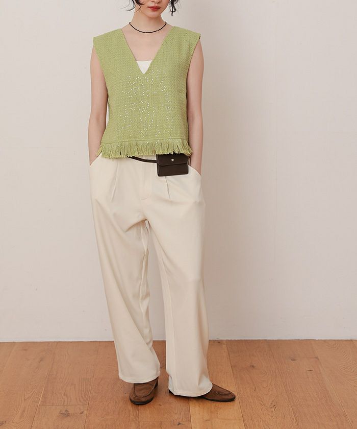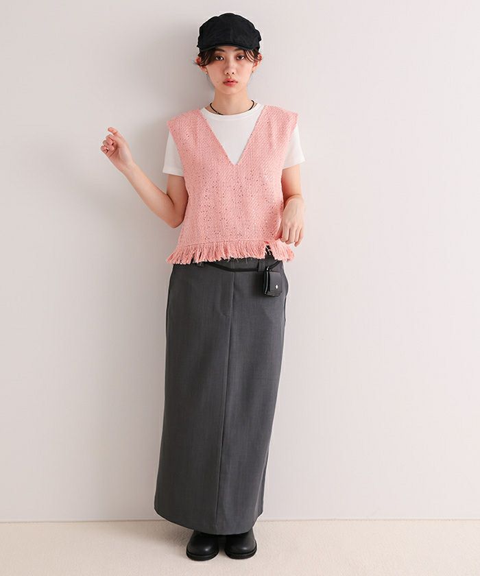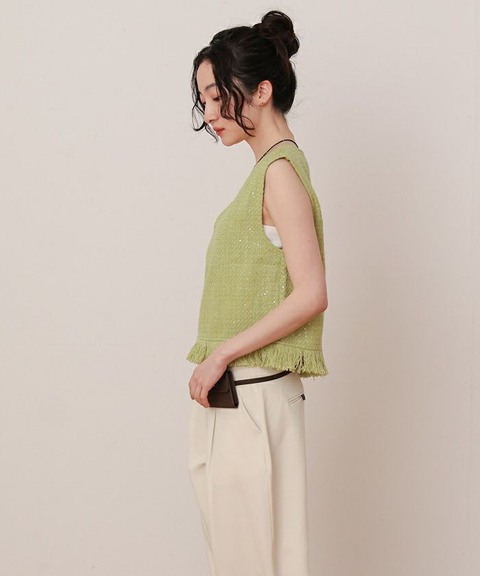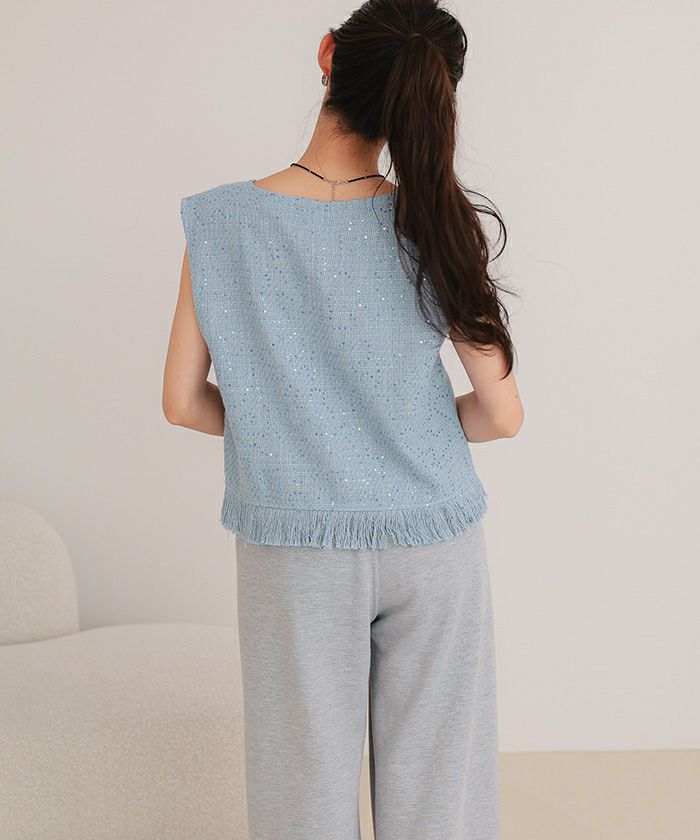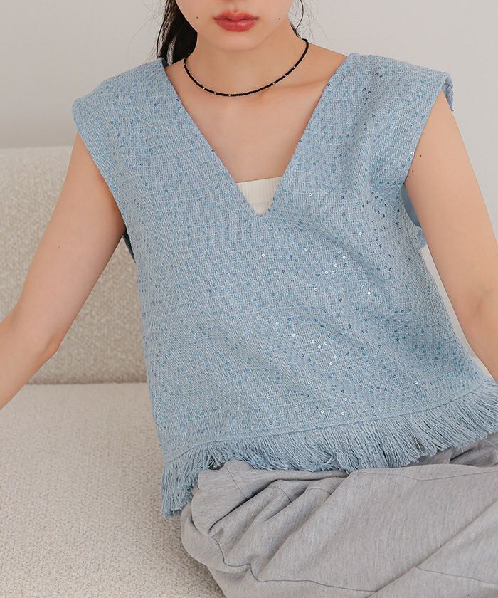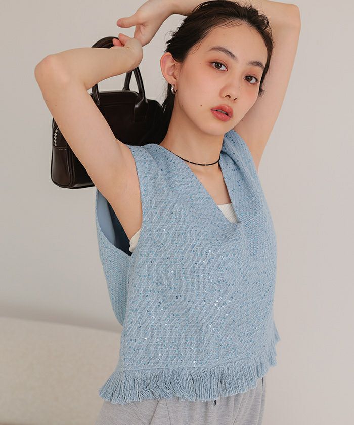スパンコールツイードフリンジショートベスト【miette ミエット】【メール便可/90】