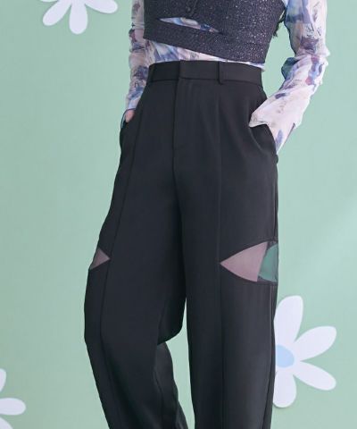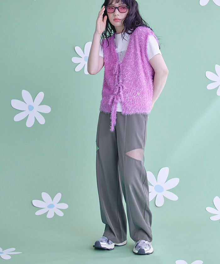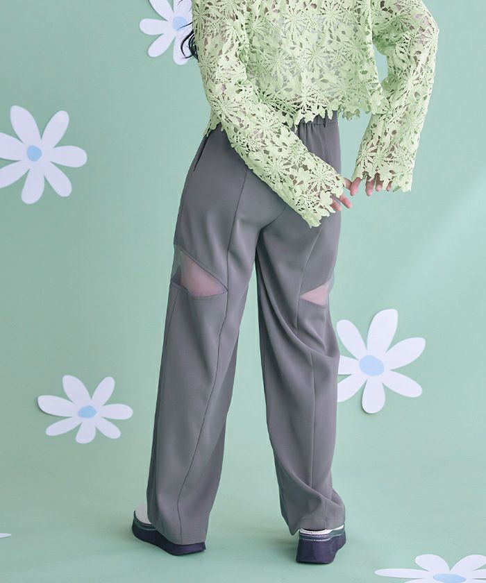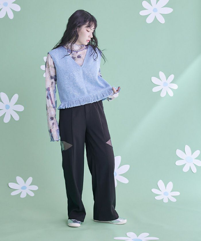 ・シアー切替が抜け感を演出するワイドパンツ。