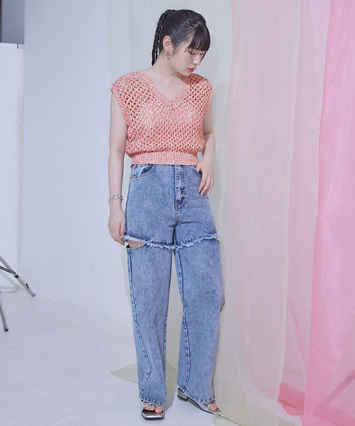 ・深めのVネックなのでTシャツやキャミソールなど、どんなトップスともレイヤードしやすいデザインです。