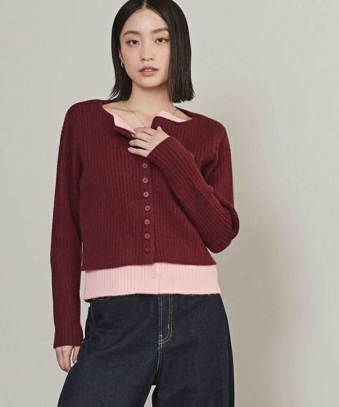 ・2枚重ねて着ているようなレイヤード風デザインが目を惹くニットカーディガン