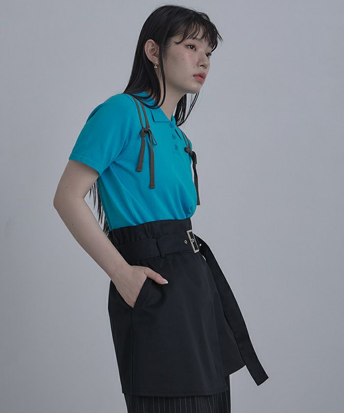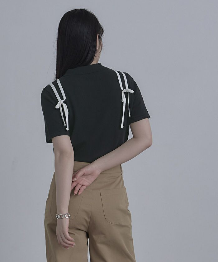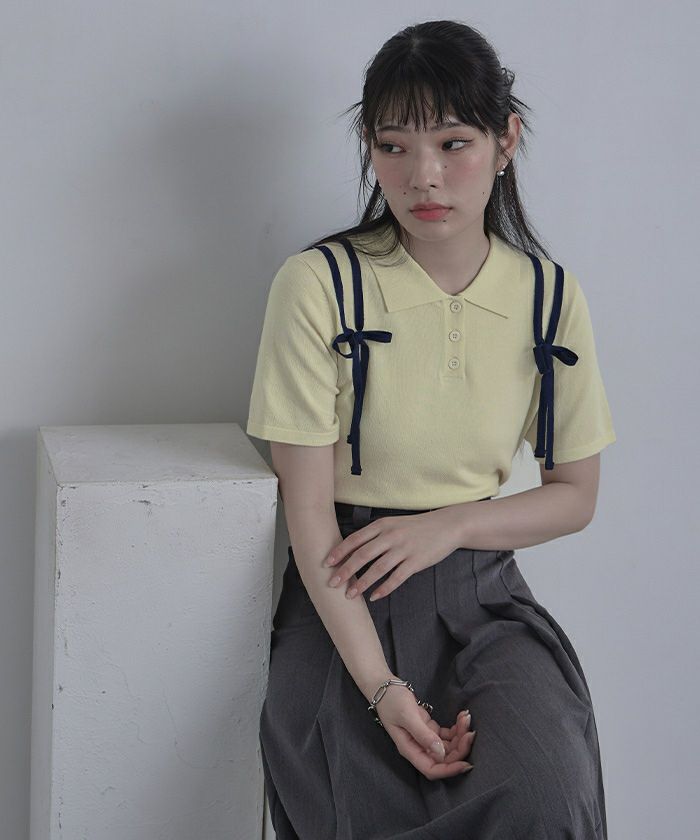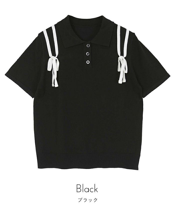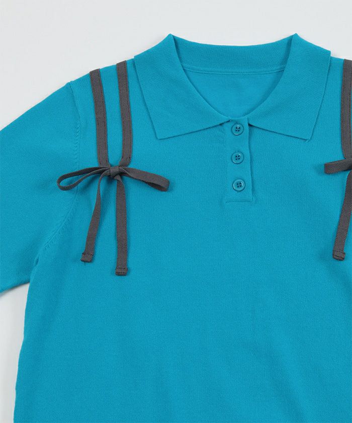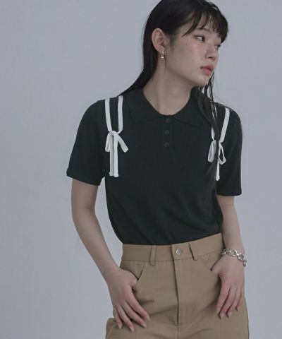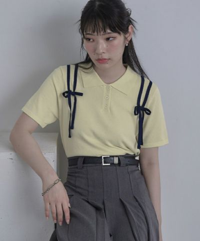 ・肩に配色のリボンテープをあしらった半袖ポロニット。