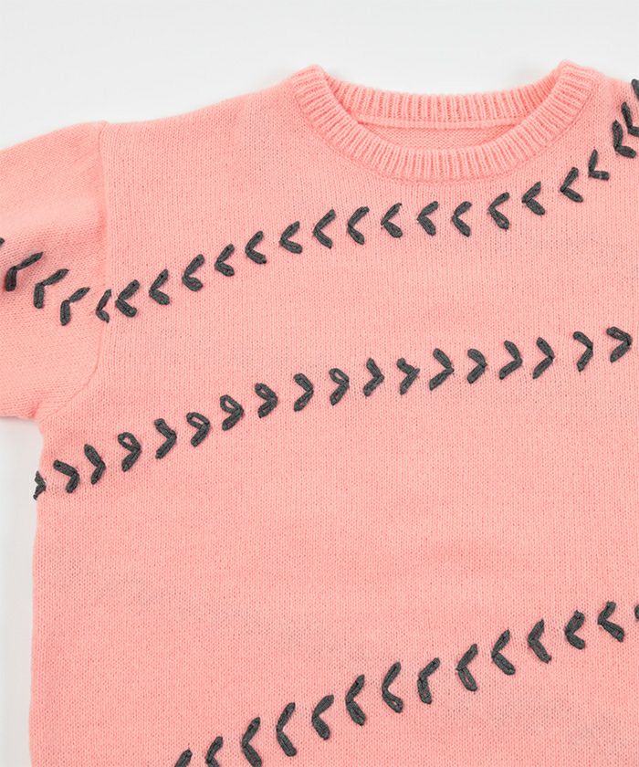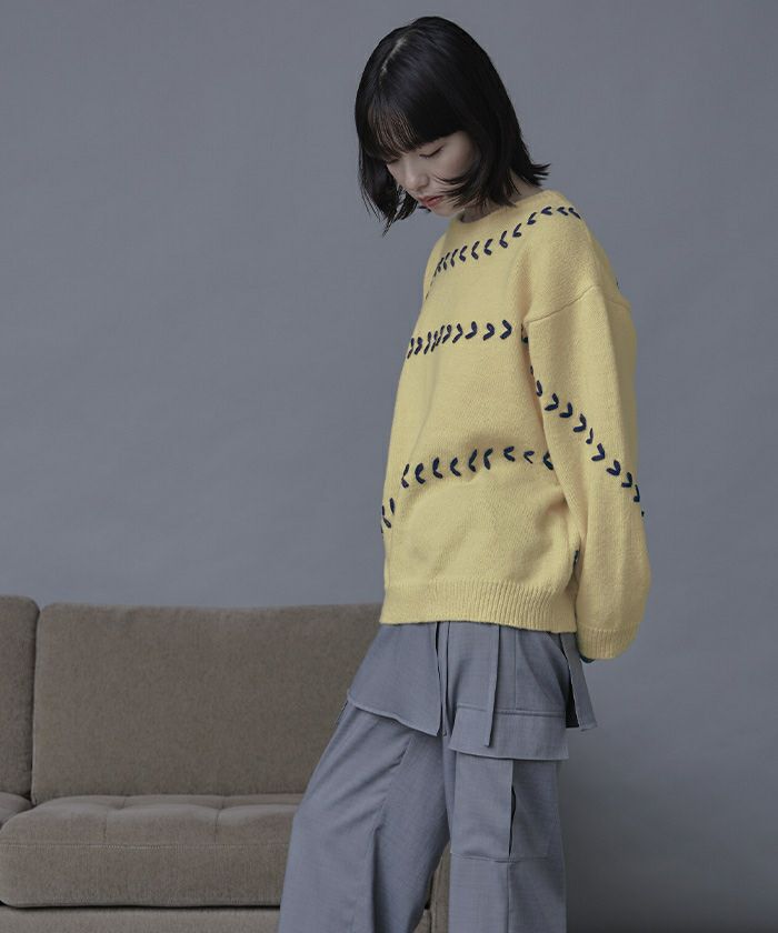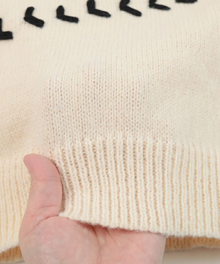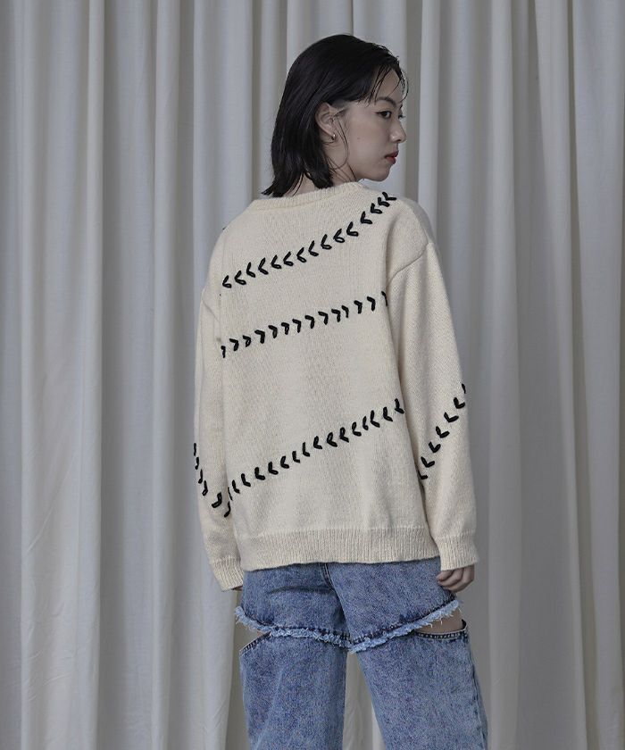 ・アシンメトリーに入った配色ステッチがポイントのニット。