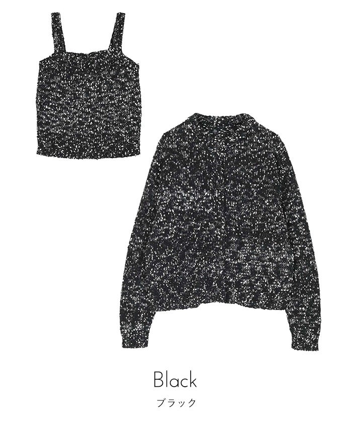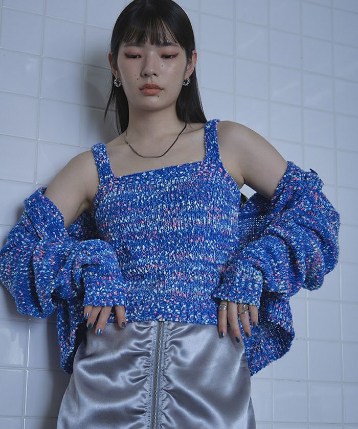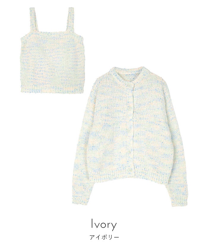 ・カラフルなネップがアクセントのカーディガンとキャミソールのアンサンブル