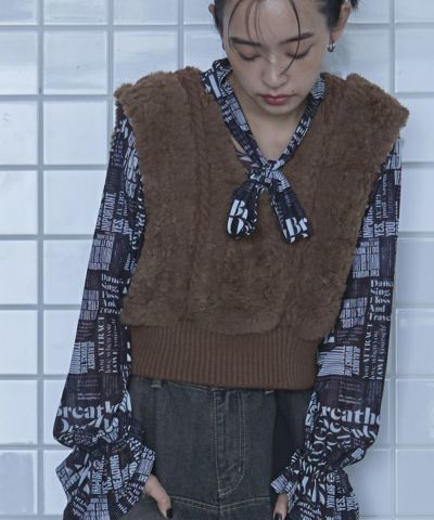 Vネックファーケーブルニットベスト