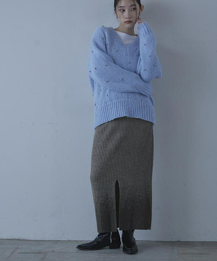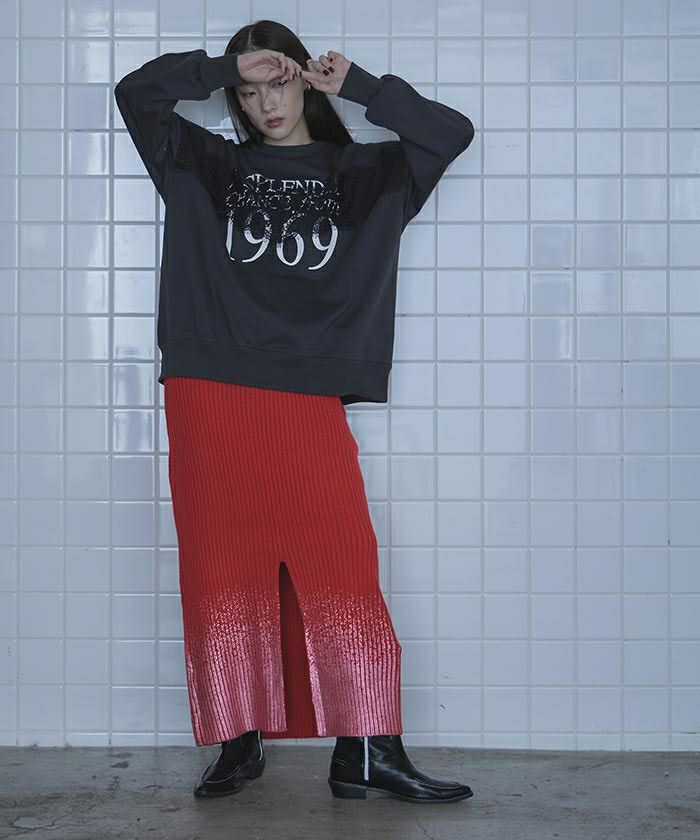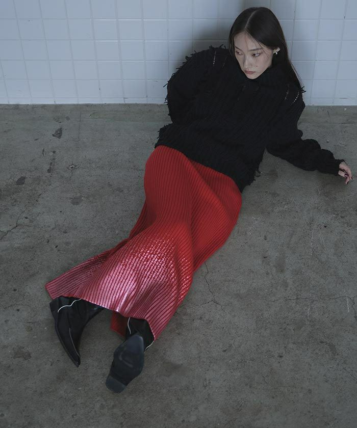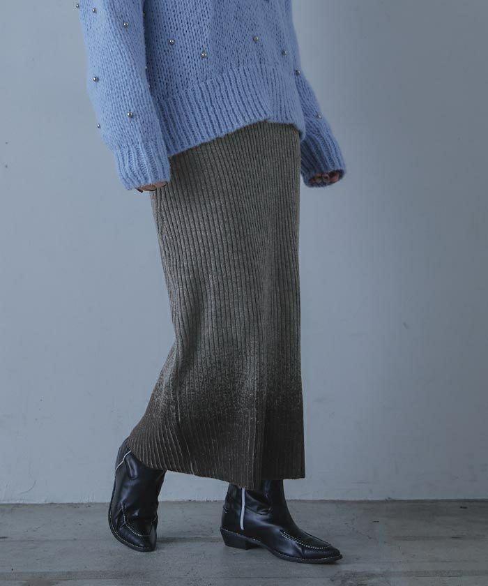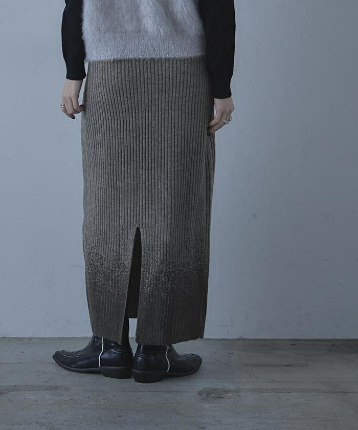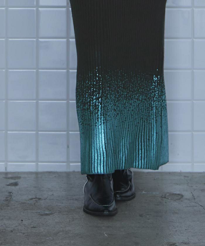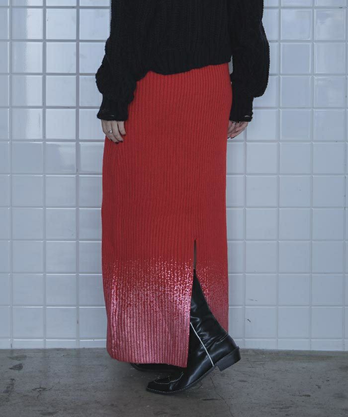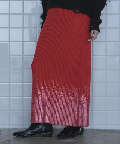 ・裾の箔プリントが魅力のニットスカート。