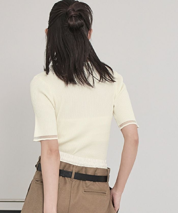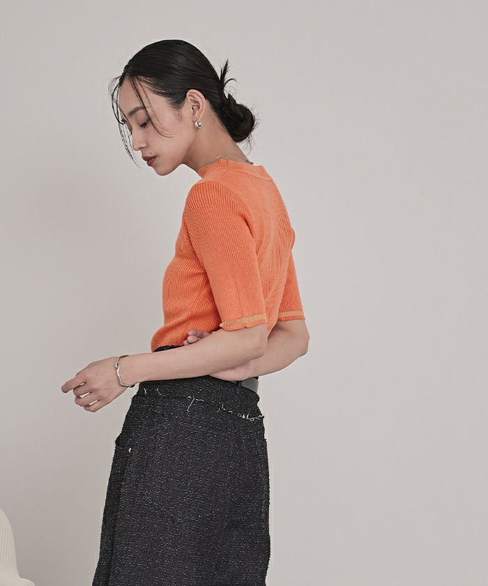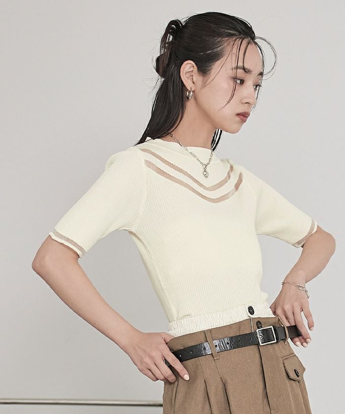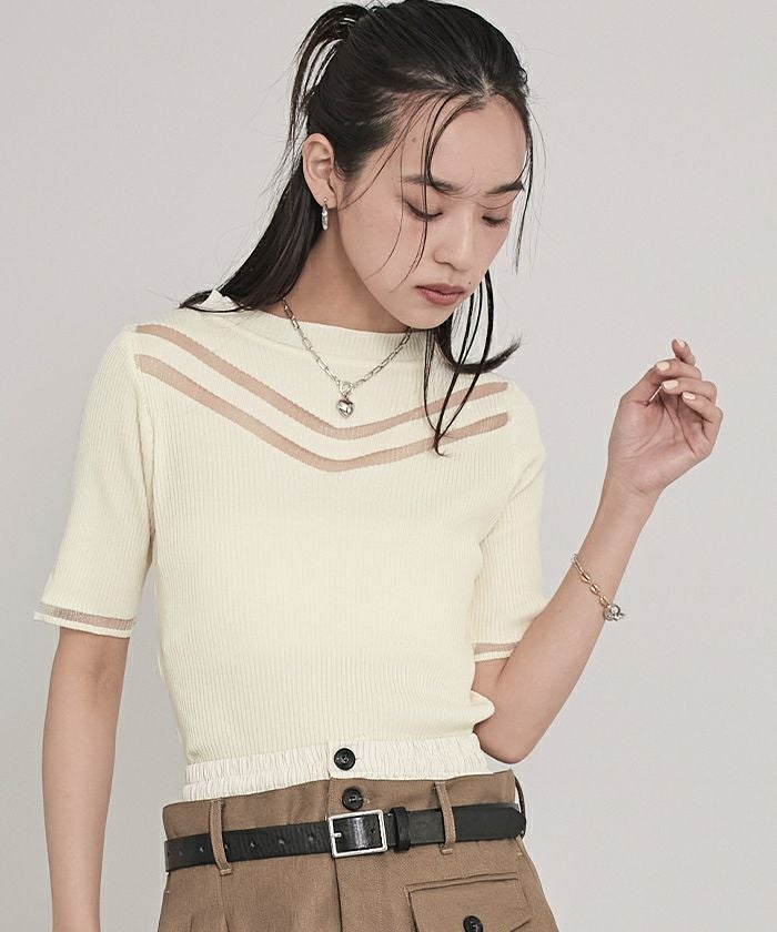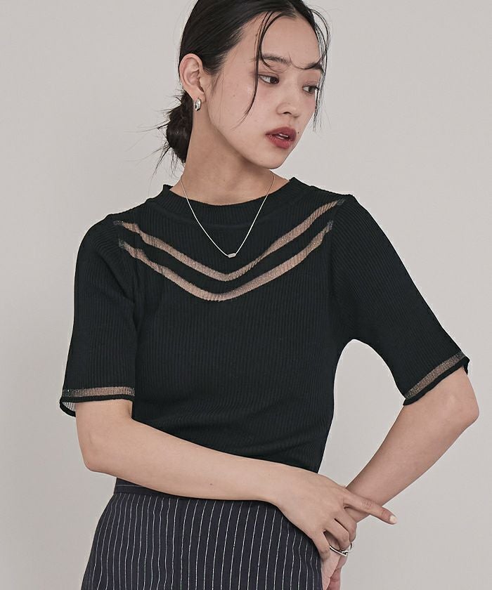 胸元と袖口にシアー感のある糸を使用し、透け感のあるラインが印象的なデザイントップス。5分袖仕様で気になる二の腕をさりげなくカバーしつつ、抜け感のあるスタイルを演出します。伸縮性のあるリブ素材を採用しており、快適でストレスフリーな着心地を実現。ベーシックなフォルムに程よくデザイン性を加えた一枚は、デイリーから特別なシーンまで幅広く活躍します。