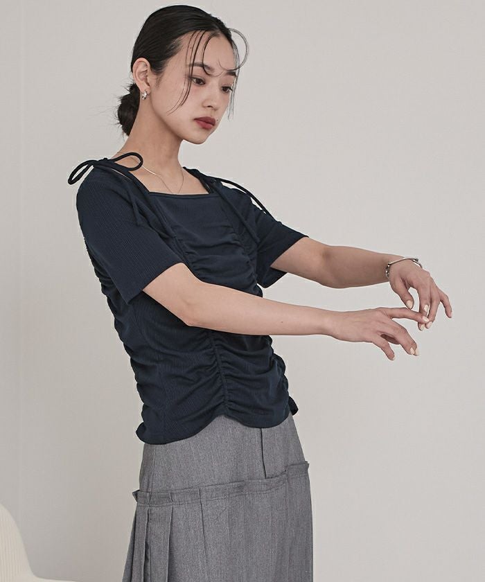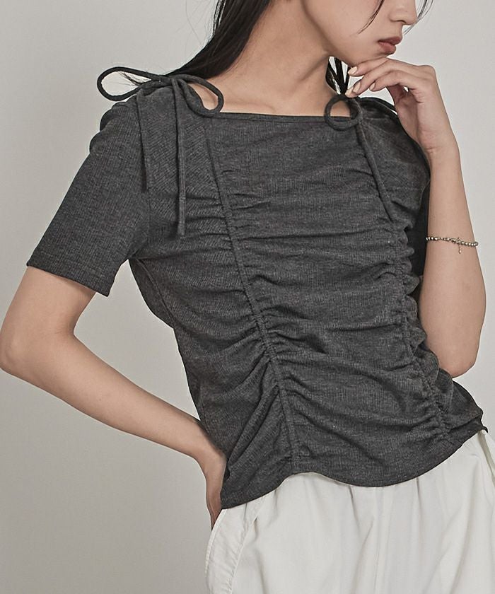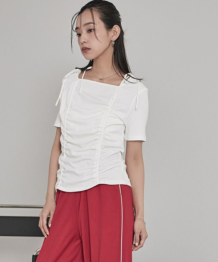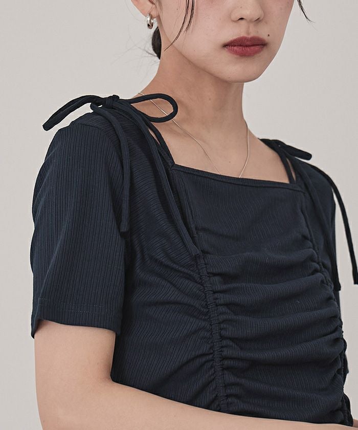 ・伸縮性のあるリブ素材でカジュアル感を演出し、肩のリボンが女性らしさもプラス◎