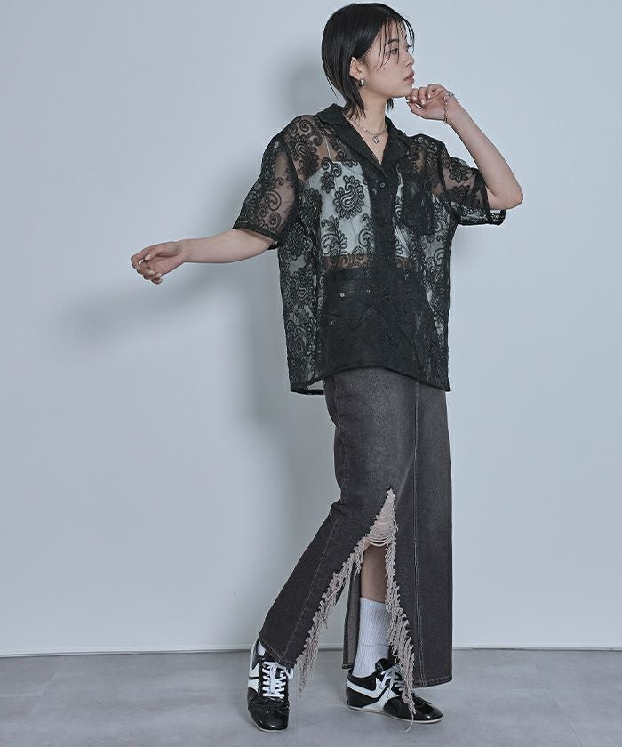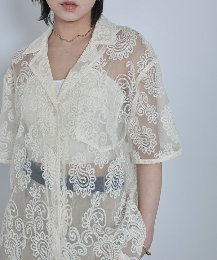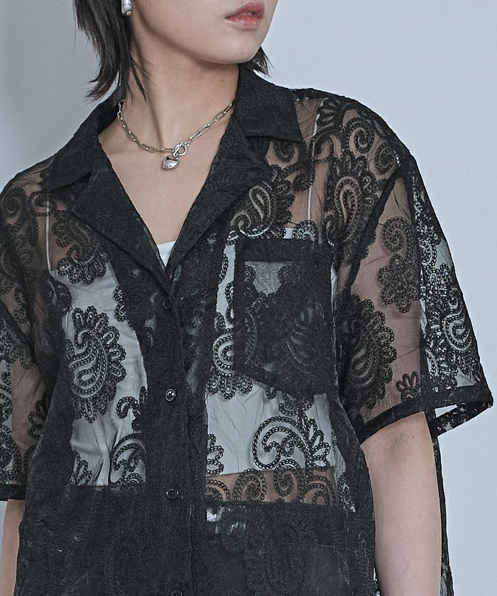 ・総柄刺繍のオーガンジー素材が高見えするシアーシャツ