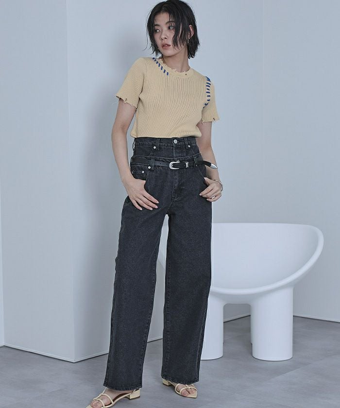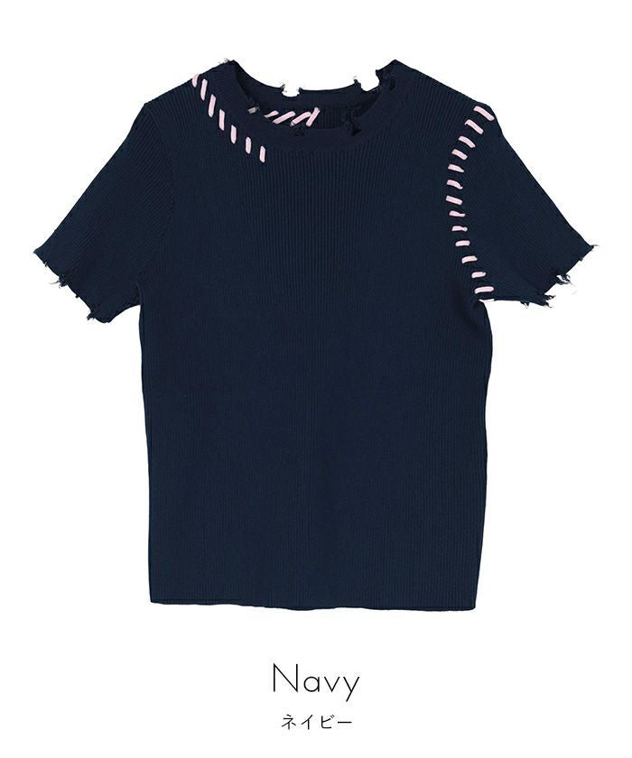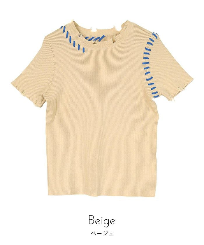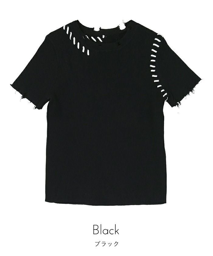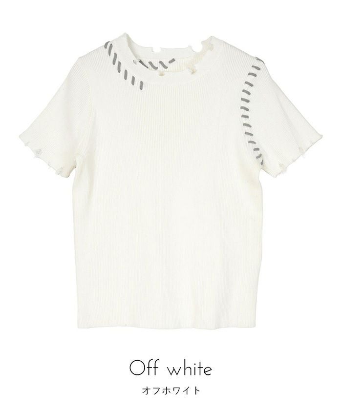 ・アシンメトリーな配色ステッチデザインが目を引くトップス