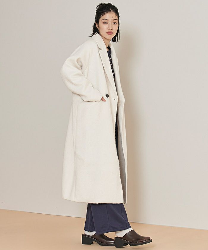 ・クラシックなチェスターコートを、毛足のある柔らかなシャギー素材でアップデート