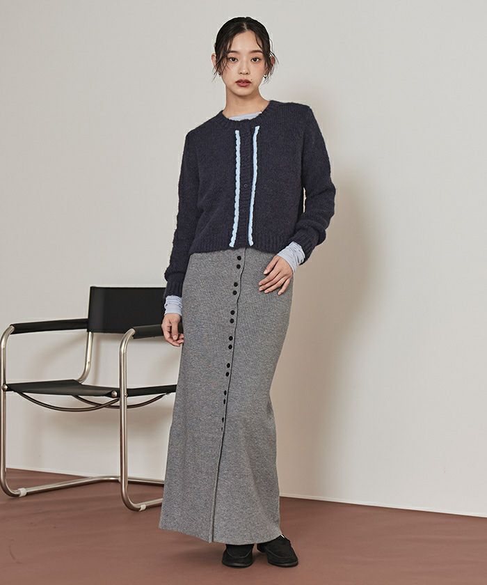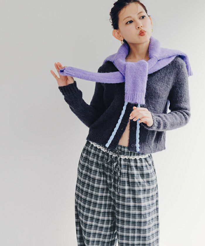 ・前立ての配色フリルがポイントのふわっとしたモヘヤライク素材ニットカーディガン