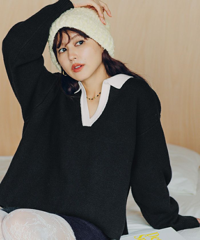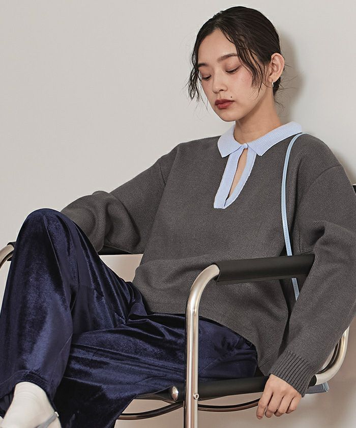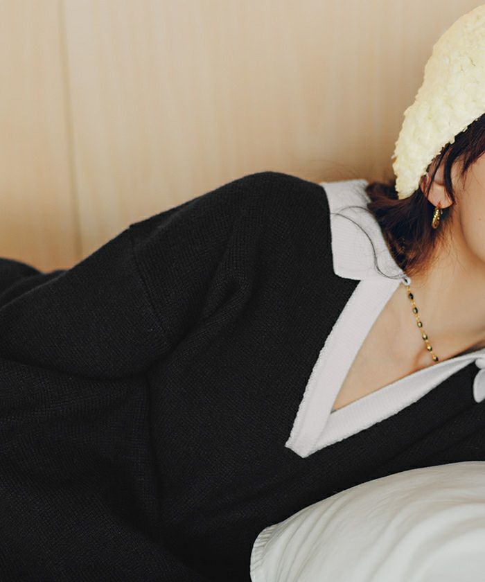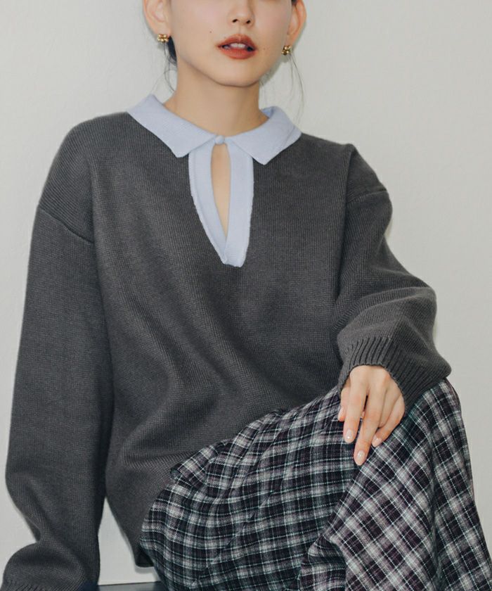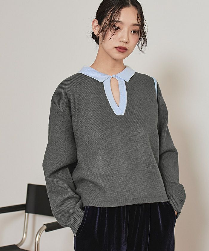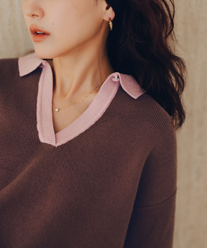 ・一枚で目を惹く襟配色スキッパーニットプルオーバー