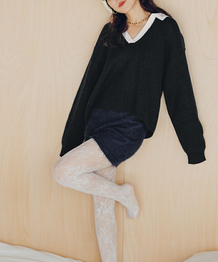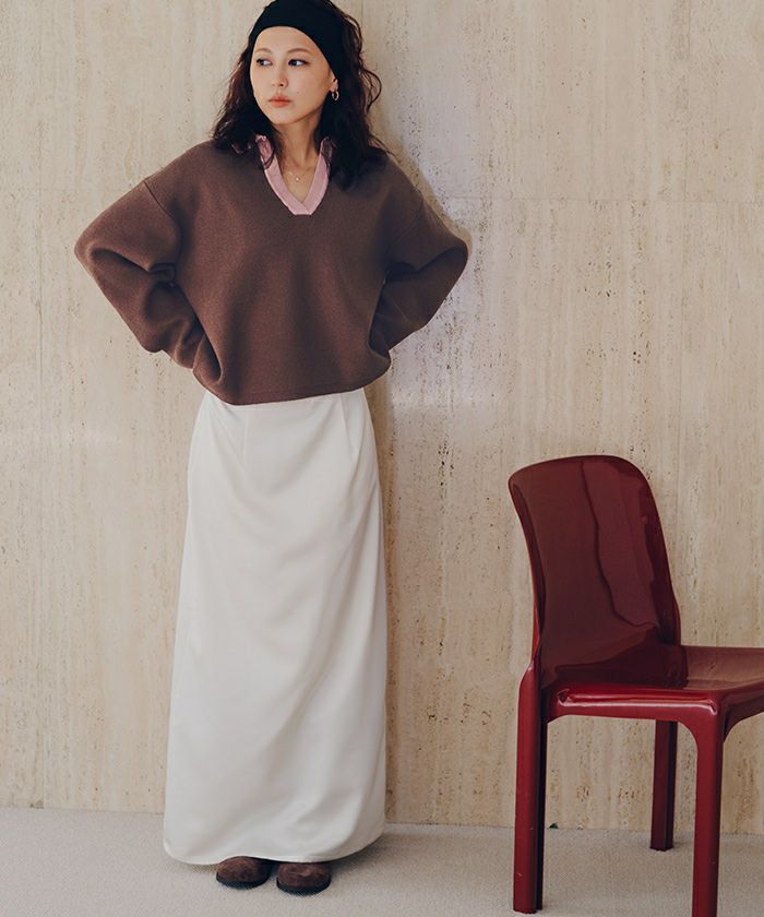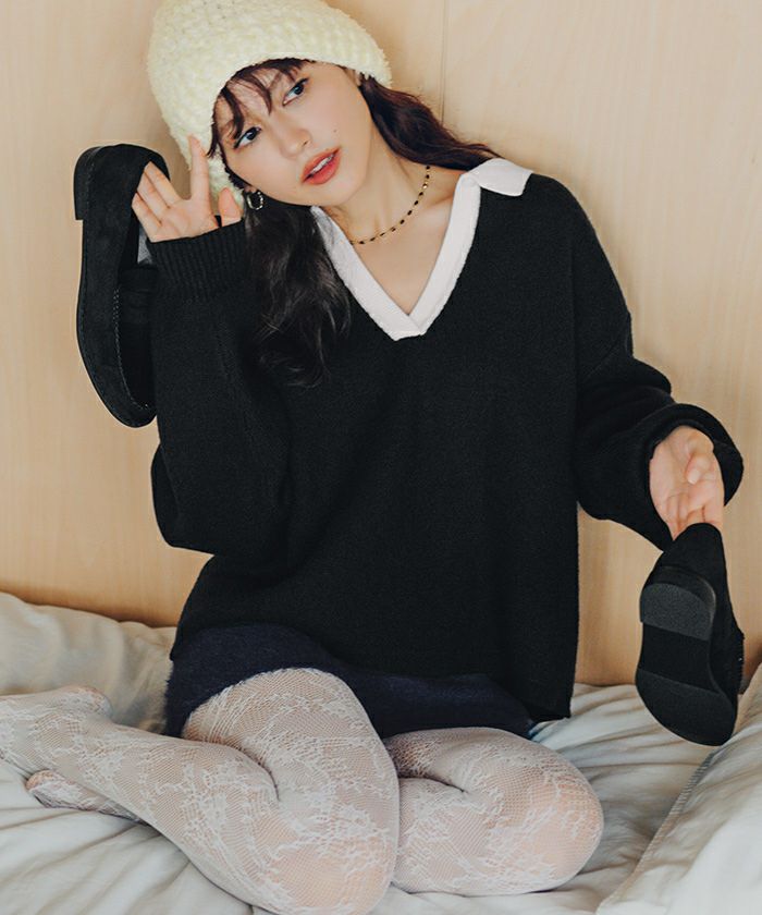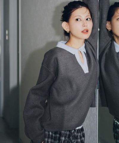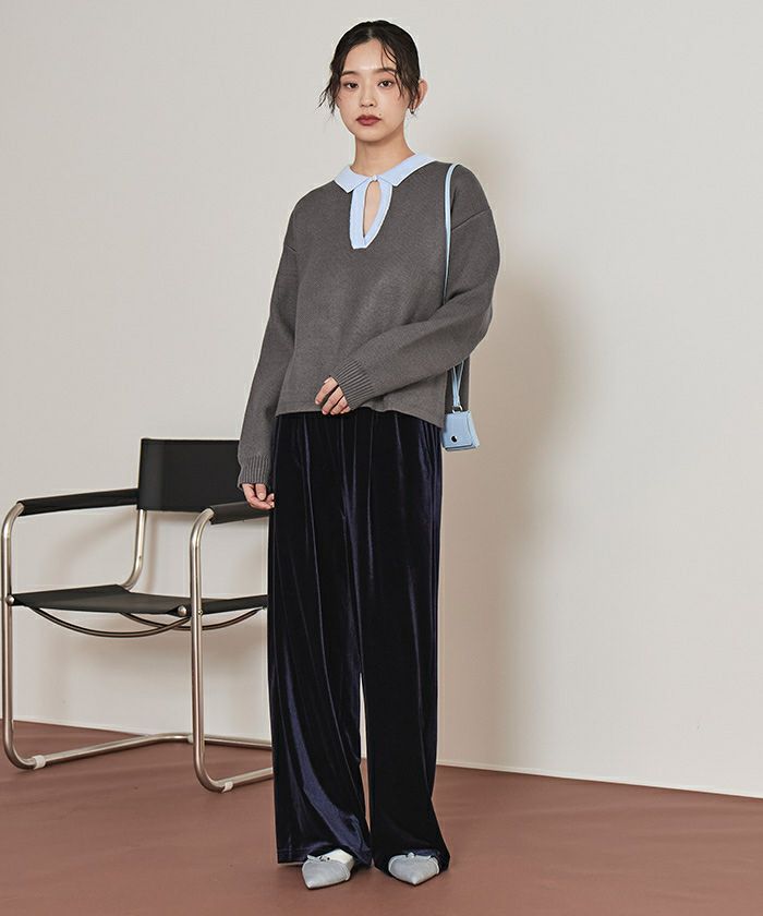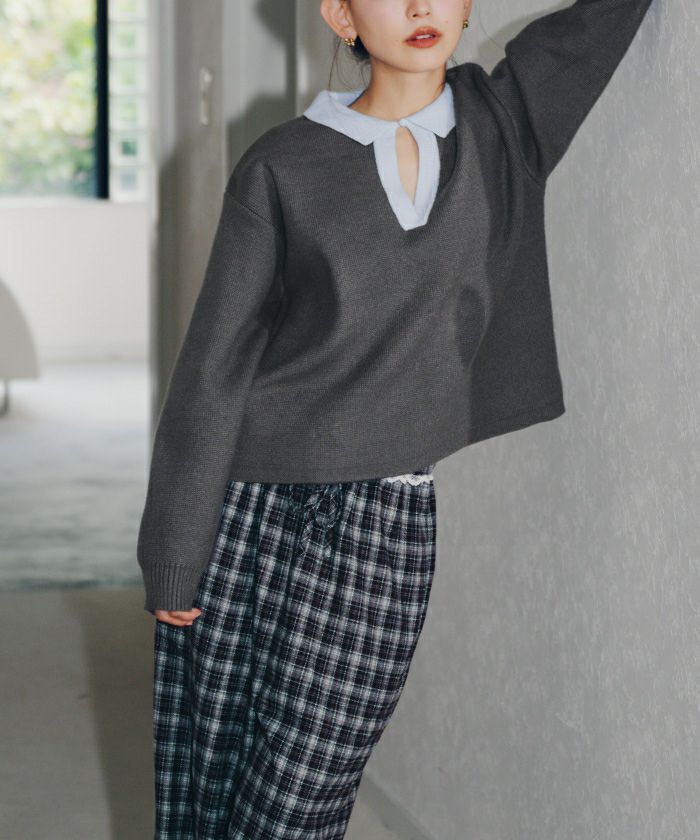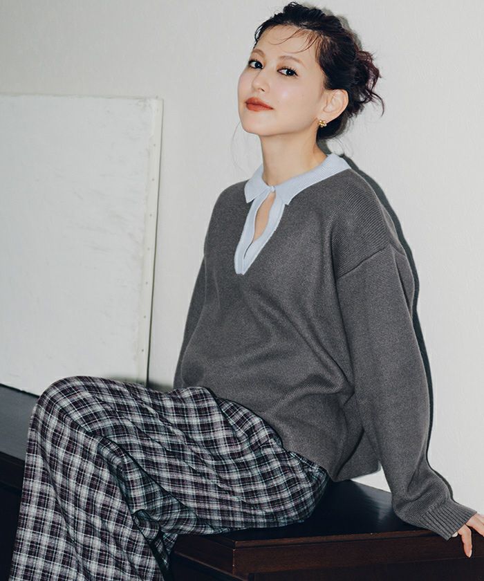 ・一枚で目を惹く襟配色スキッパーニットプルオーバー