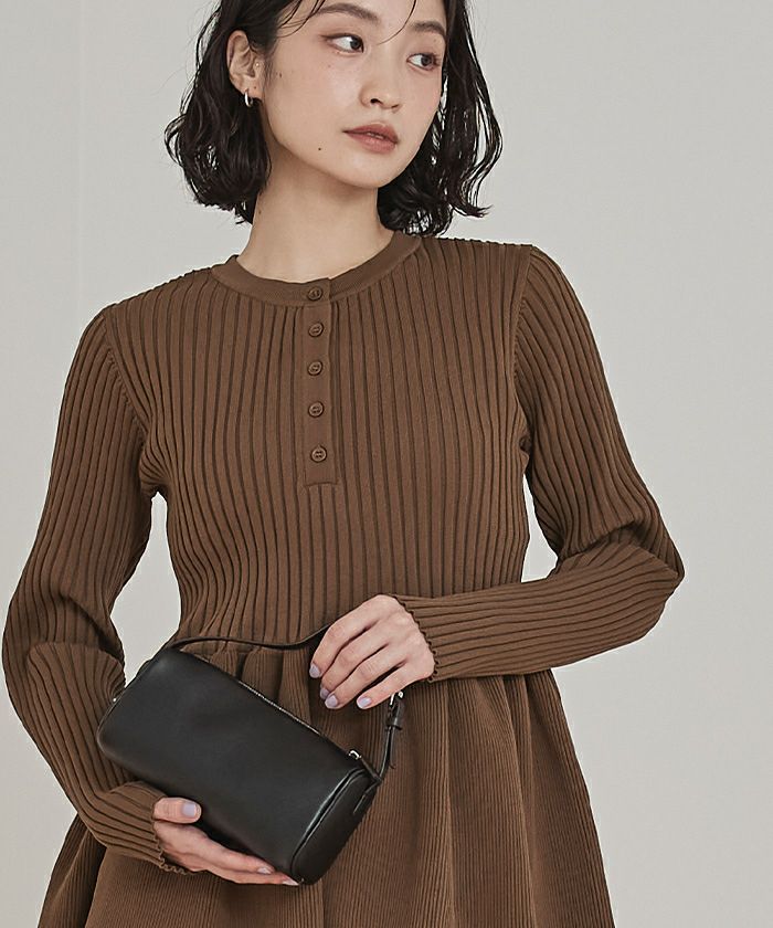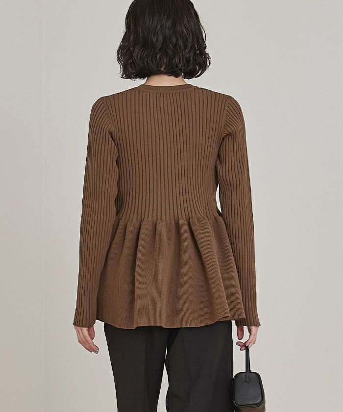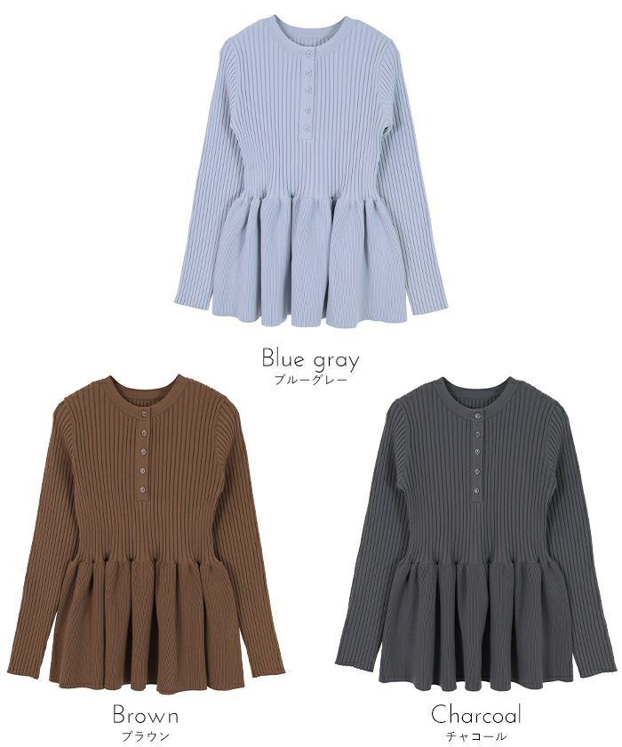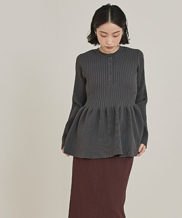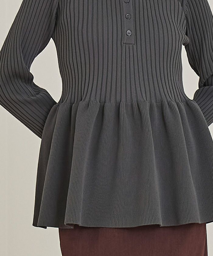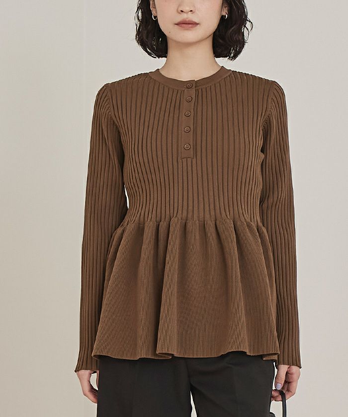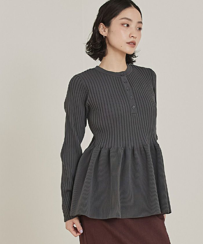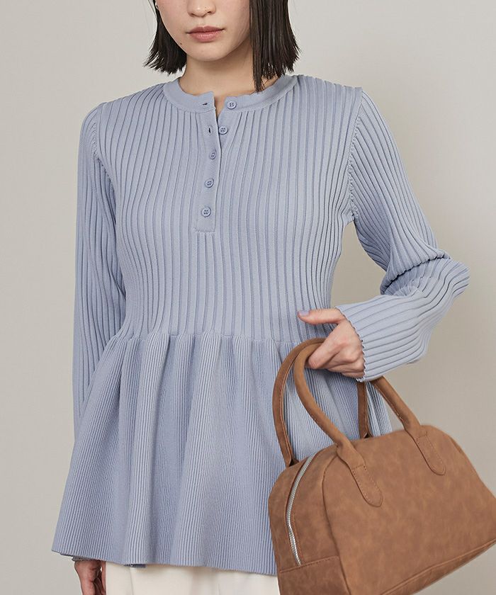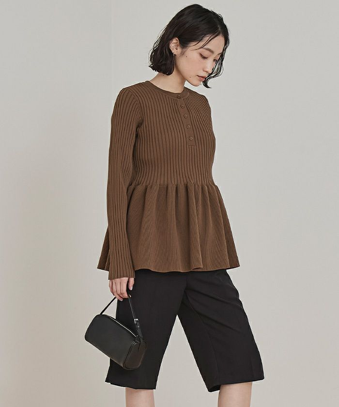 ・トレンドのヘンリーネックが引き立つ、ペプラムラインのリブニット
