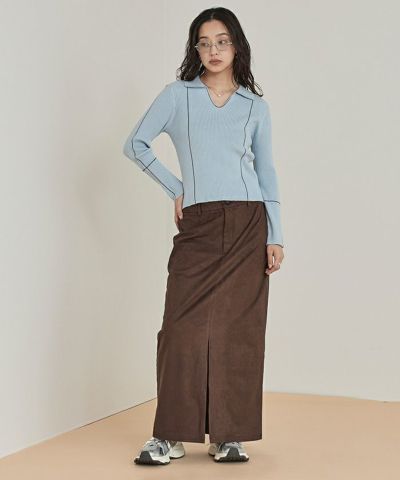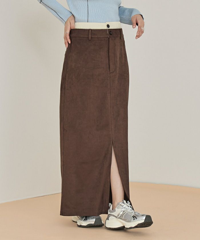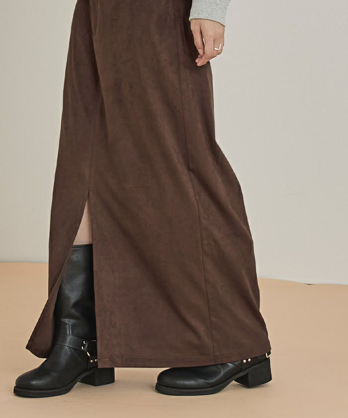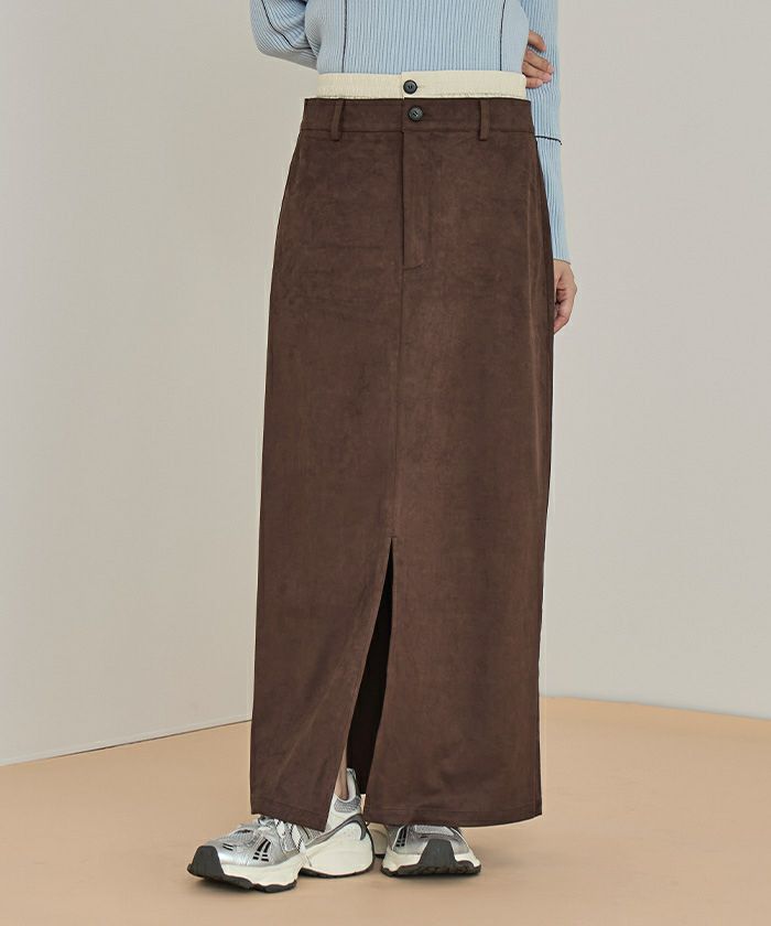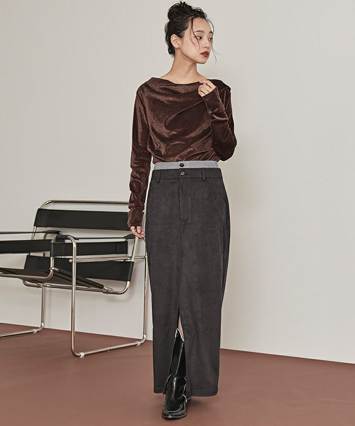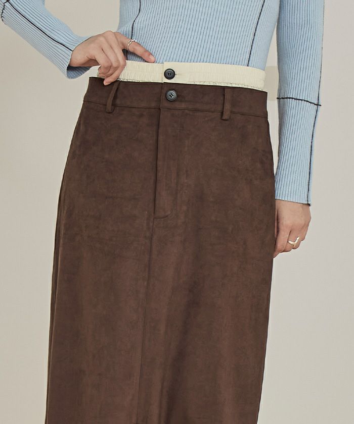 ・滑らかな手触りとツヤ感が魅力のフェイクスエード素材を使用したWウエストロングスカート