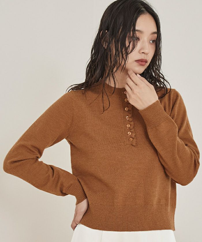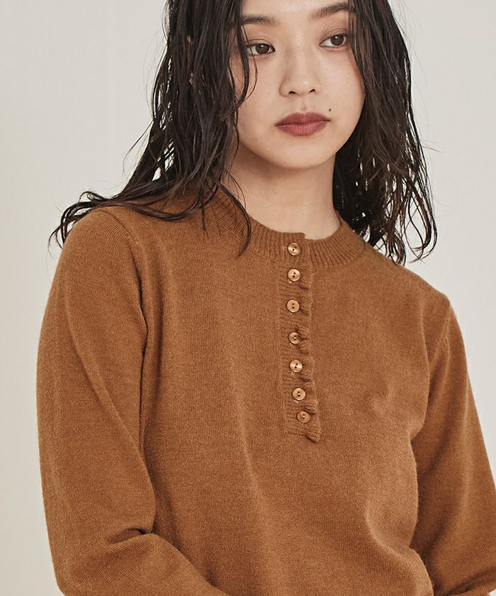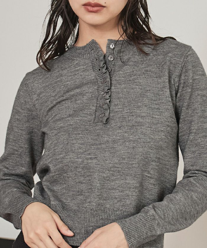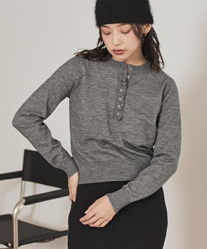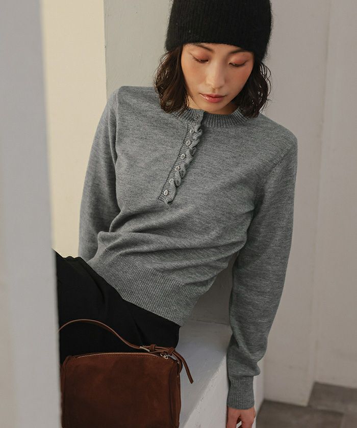 ・コンパクトなシルエットで前立てに細かなフリルをあしらった上品なヘンリーネックニット