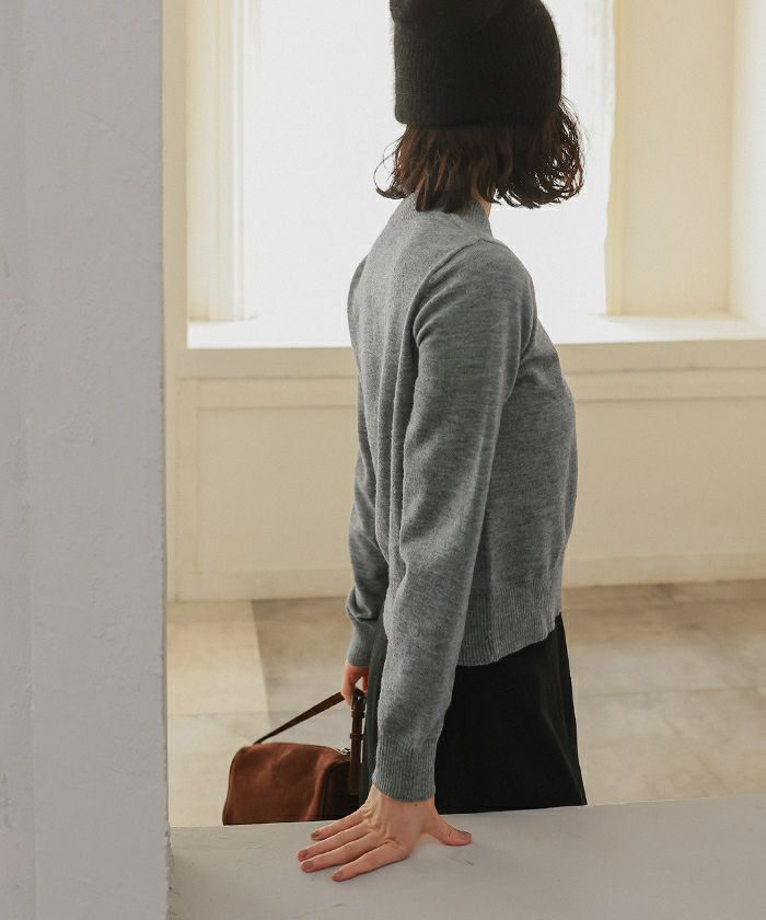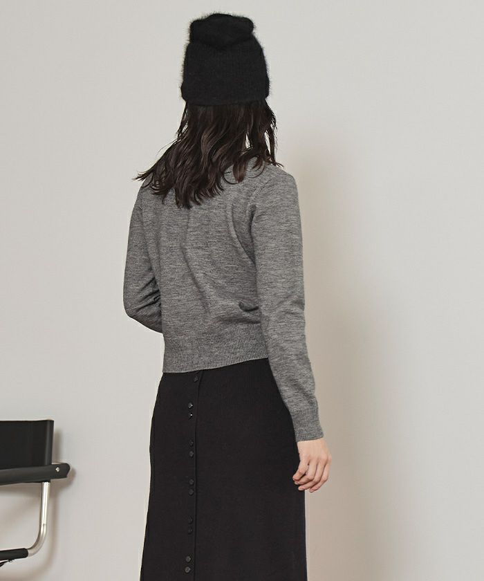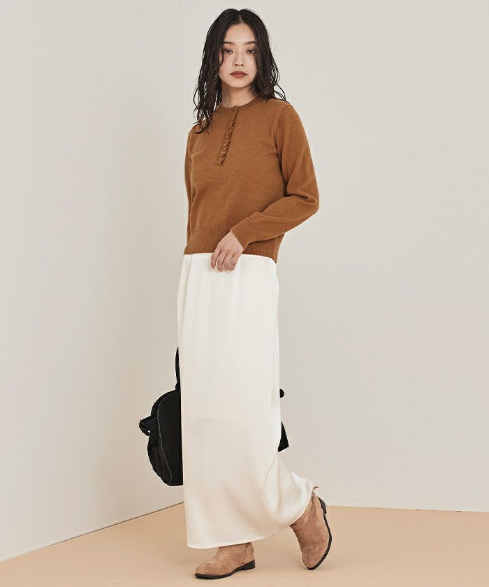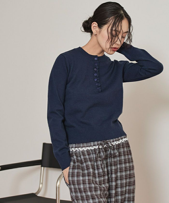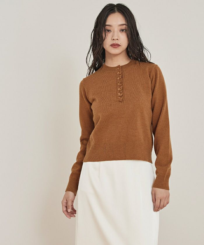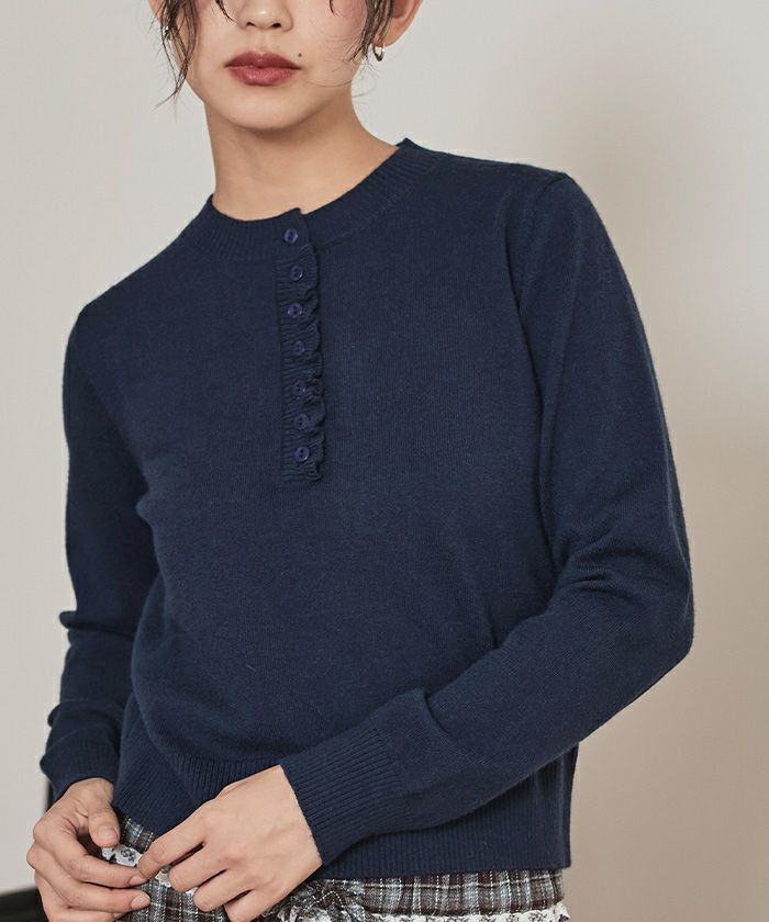 ・コンパクトなシルエットで前立てに細かなフリルをあしらった上品なヘンリーネックニット